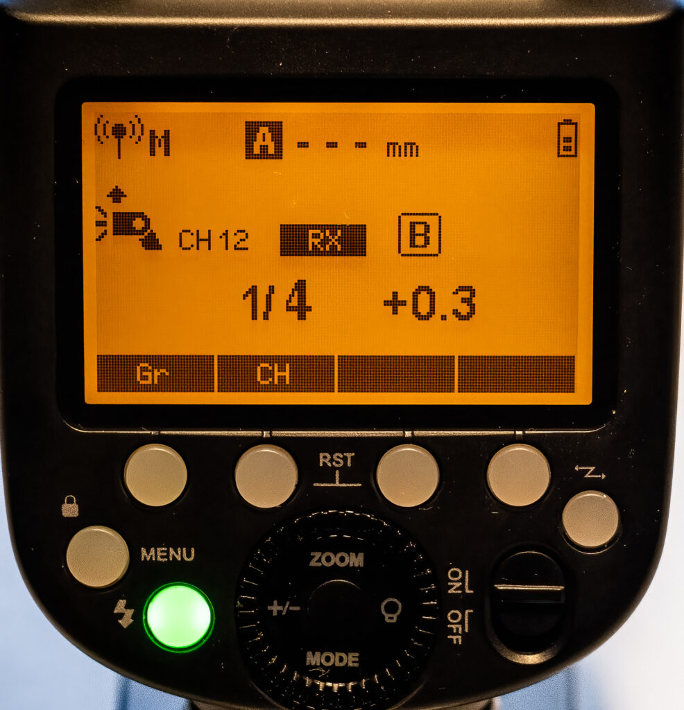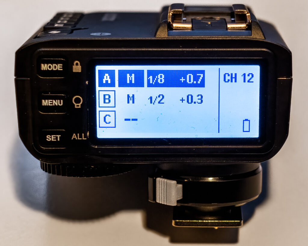 Die beiden Blitze (Slaves) sind von Kamera getrennt und werden in diesem Beispiel über den Master getriggert. Der Trigger X2T-F kommuniziert über den Blitzschuh mit der Kamera Fuji X-T5 und steuert über Die Gruppe A den Blitz V350F und über die Gruppe B den Blitz V1F. Der Funkkanal ist in diesem Beispiel CH 12.