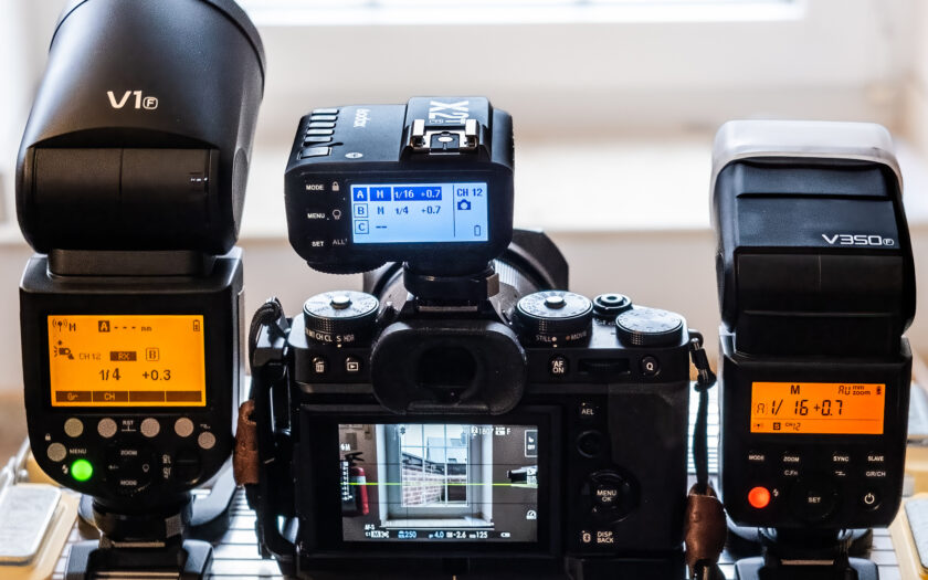 Die beiden Blitze (Slaves) sind von Kamera getrennt und werden in diesem Beispiel über den Master getriggert. Der Trigger X2T-F kommuniziert über den Blitzschuh mit der Kamera Fuji X-T5 und steuert über Die Gruppe A den Blitz V350F und über die Gruppe B den Blitz V1F. Der Funkkanal ist in diesem Beispiel CH 12.