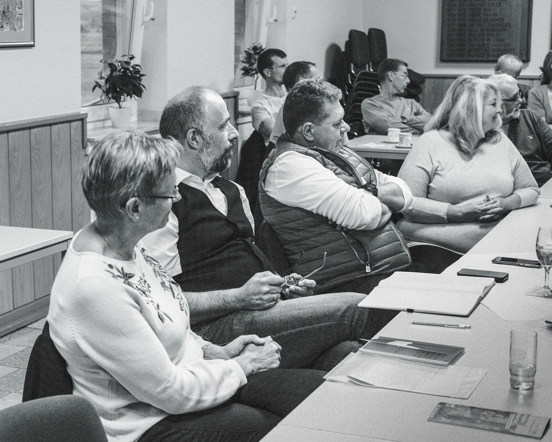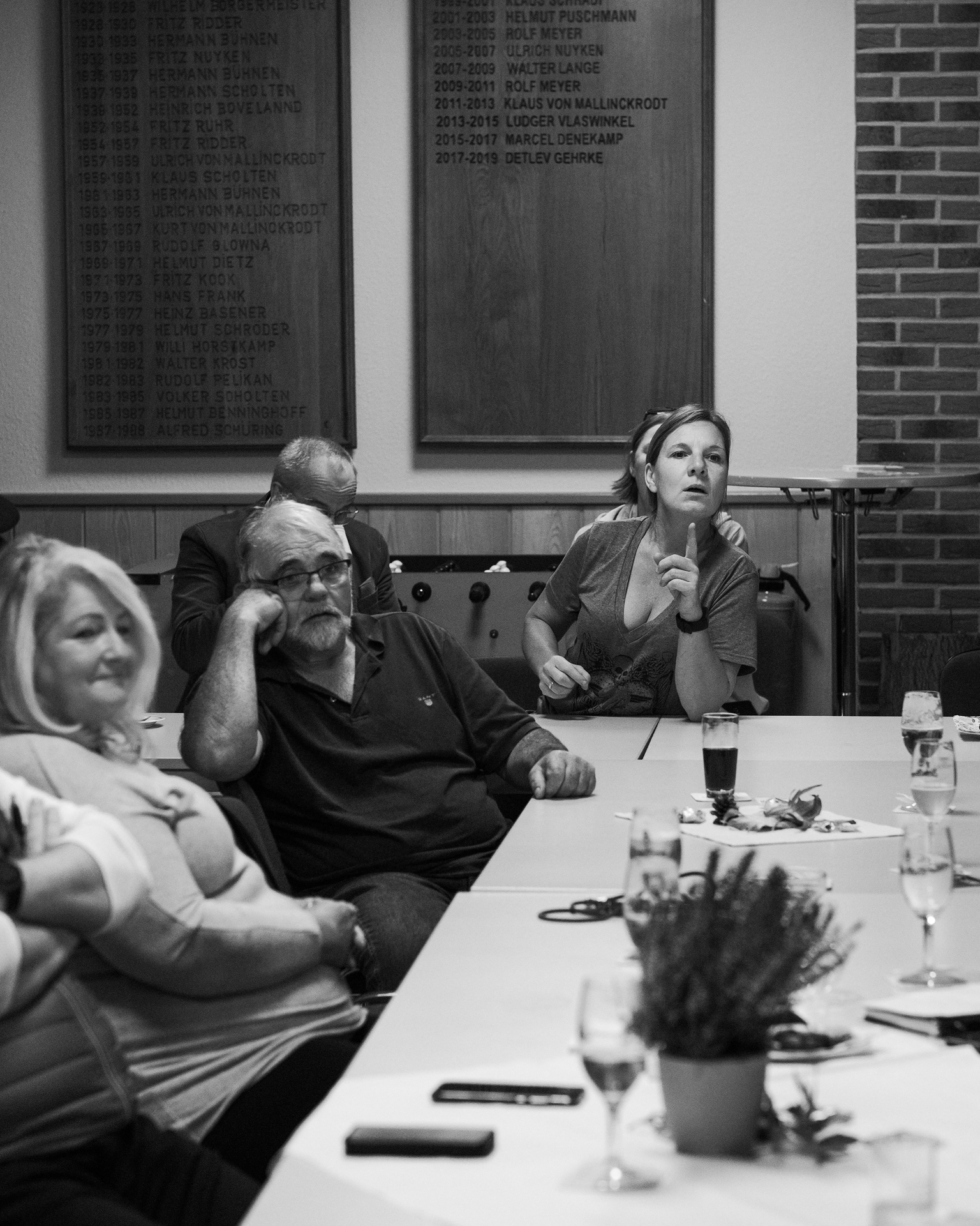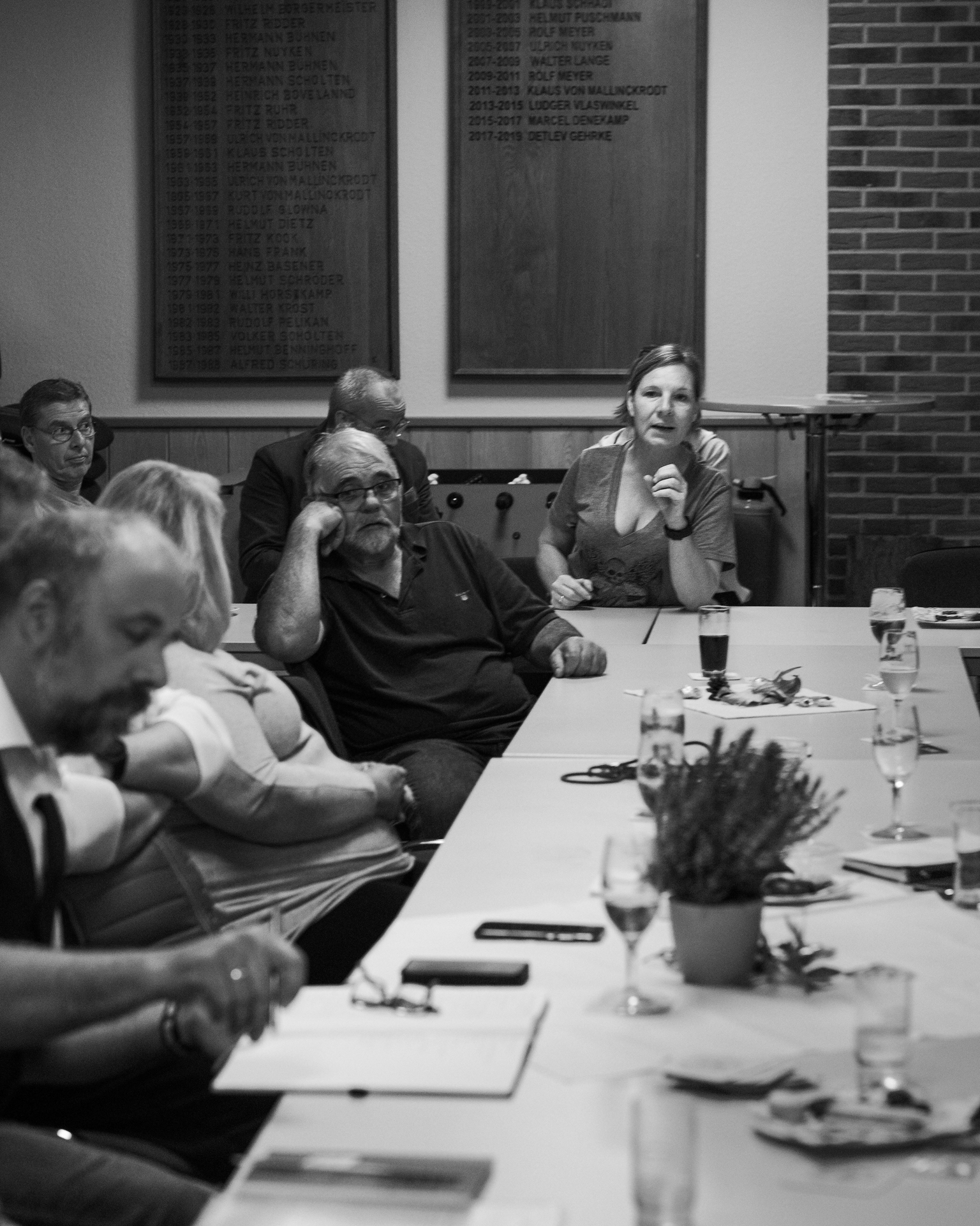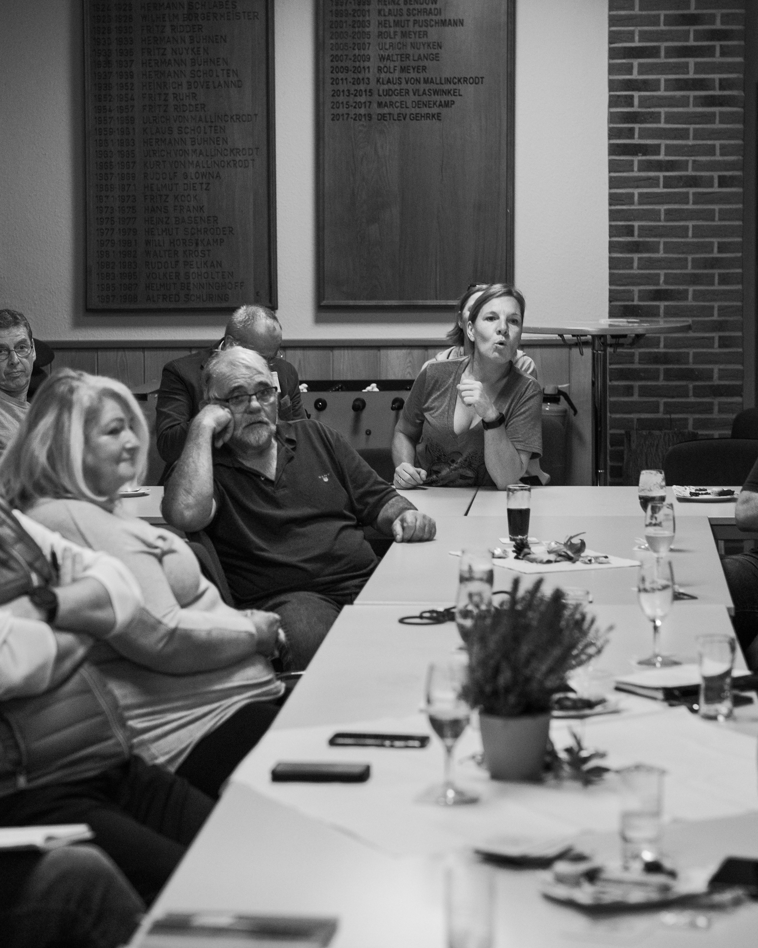 Im voll besetzten Saal durfte ich mit meinen beiden lautlosen Kameras dabei sein. Die Lichtverhältnisse setzten sich aus verschiedenen Kunstlichtquellen und Tageslicht zusammen, das durch die Fenster und zwei große Türen – meist als Gegenlicht – den Saal ganz unterschiedlich ausleuchtete. Gegen Ende der Veranstaltung wurde es erst dämmrig und dann dunkel. Da ich ohne Blitz mit dem jeweils verfügbaren Licht arbeite, um möglichst authentisch zu bleiben, war es nicht immer ganz einfach. Mit etwas Geschick bei der Positionierung der Kamera, lichtstarken Objektiven und meist weit geöffneten Blenden sowie Flexibiltät im Weißabgleich jedoch ganz gut beherrschbar.