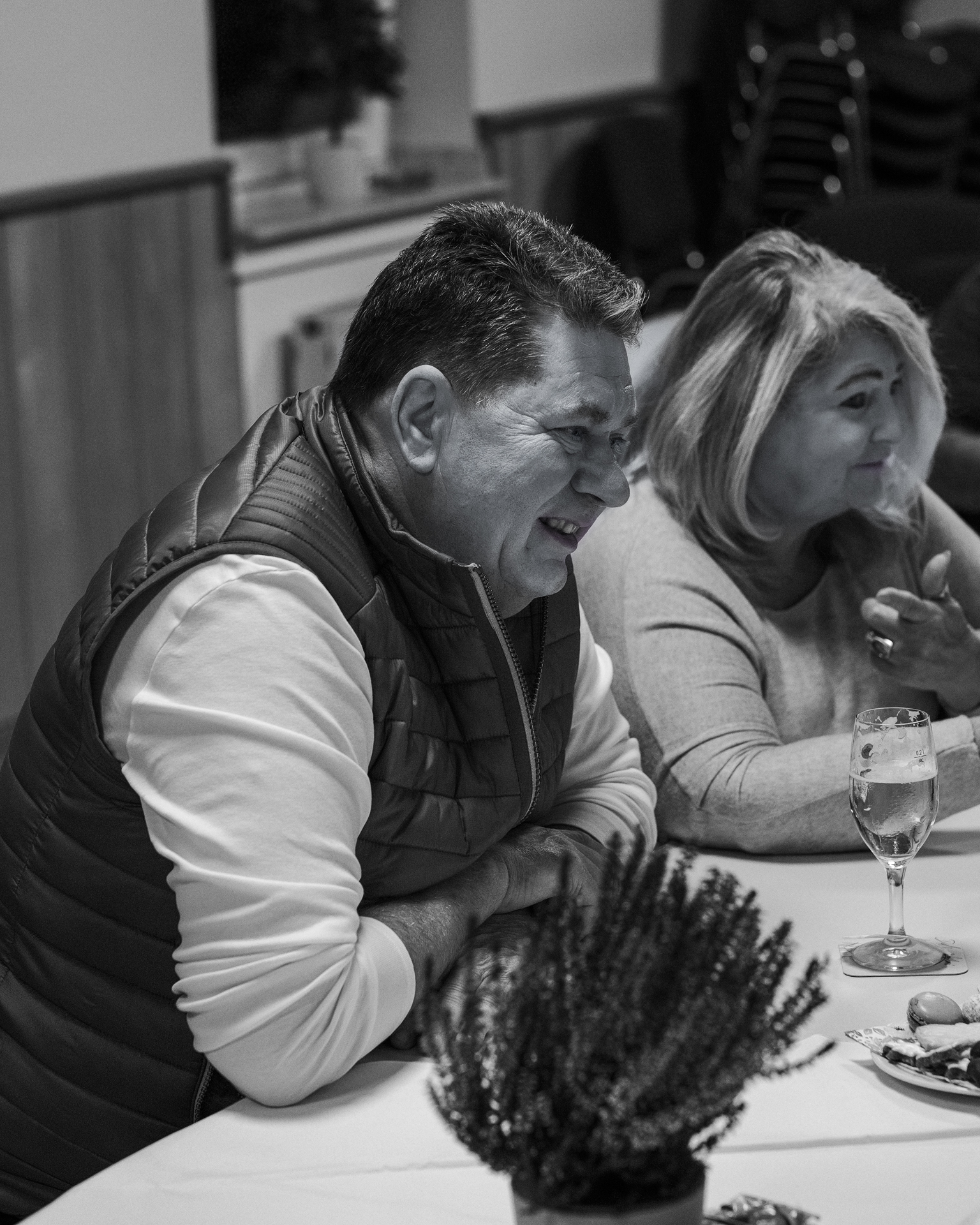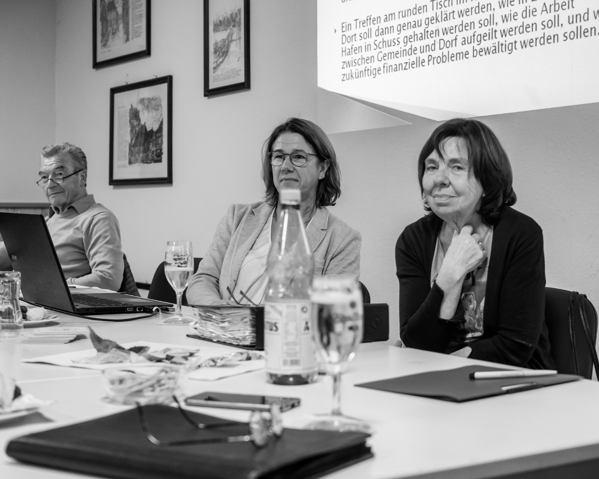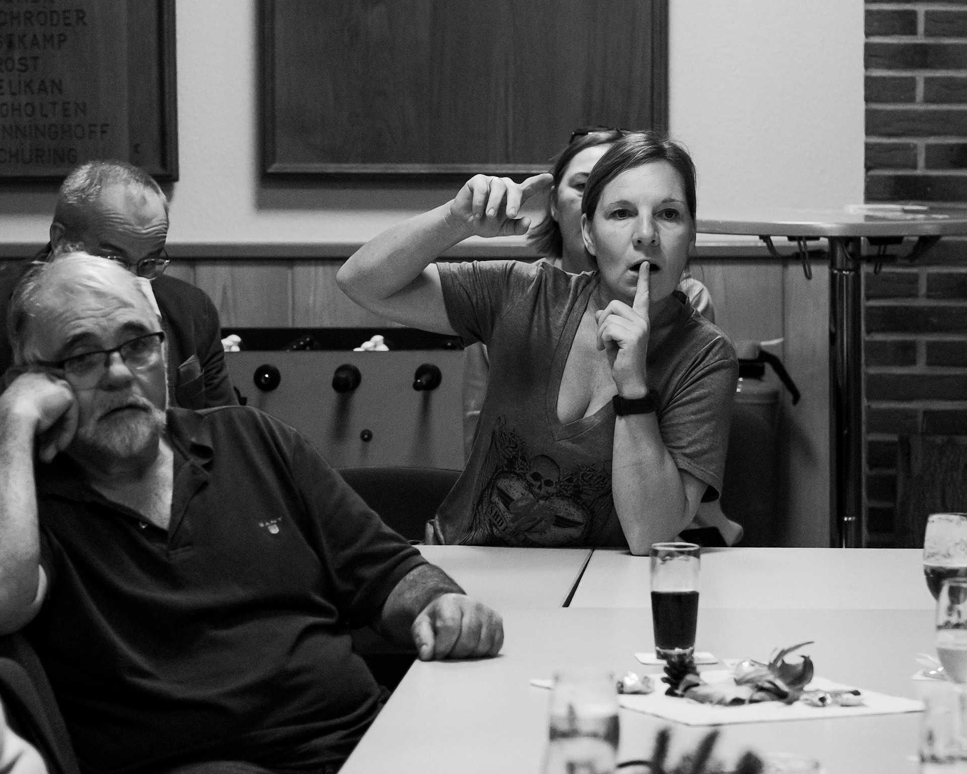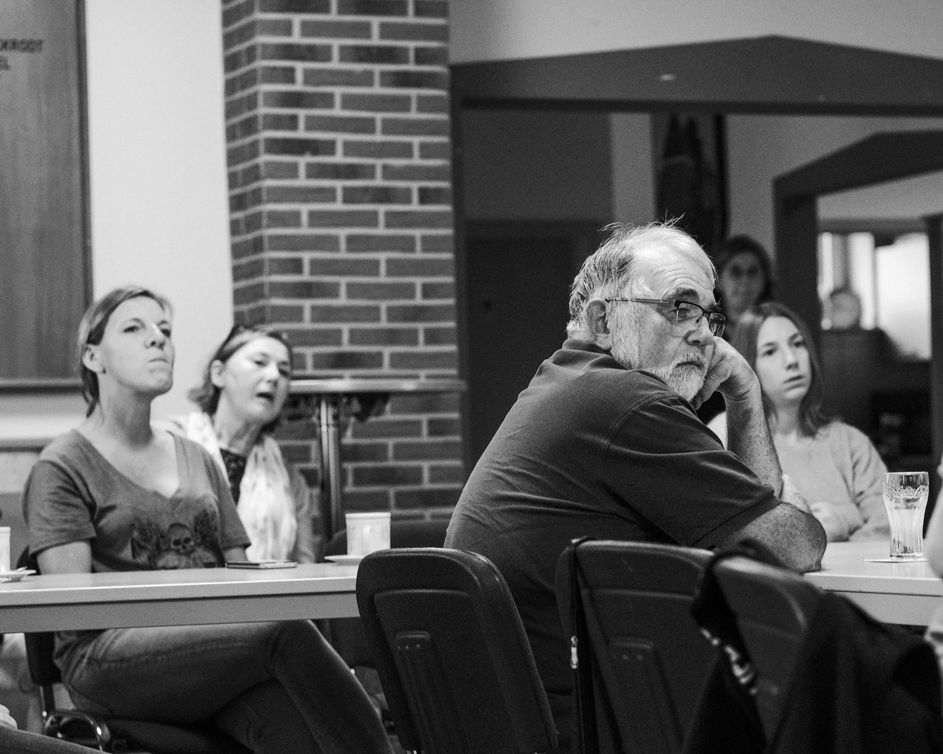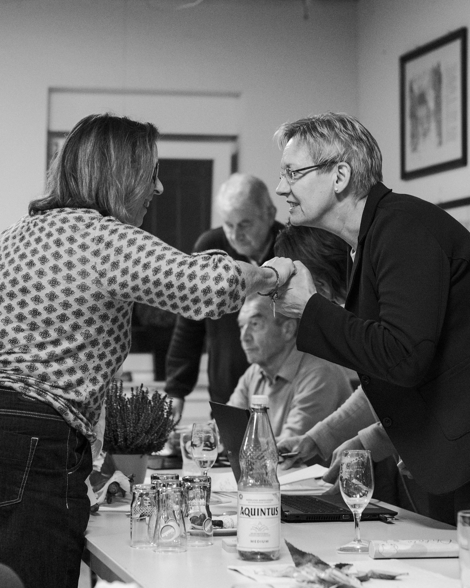 Im voll besetzten Saal durfte ich mit meinen beiden lautlosen Kameras dabei sein. Die Lichtverhältnisse setzten sich aus verschiedenen Kunstlichtquellen und Tageslicht zusammen, das durch die Fenster und zwei große Türen – meist als Gegenlicht – den Saal ganz unterschiedlich ausleuchtete. Gegen Ende der Veranstaltung wurde es erst dämmrig und dann dunkel. Da ich ohne Blitz mit dem jeweils verfügbaren Licht arbeite, um möglichst authentisch zu bleiben, war es nicht immer ganz einfach. Mit etwas Geschick bei der Positionierung der Kamera, lichtstarken Objektiven und meist weit geöffneten Blenden sowie Flexibiltät im Weißabgleich jedoch ganz gut beherrschbar.