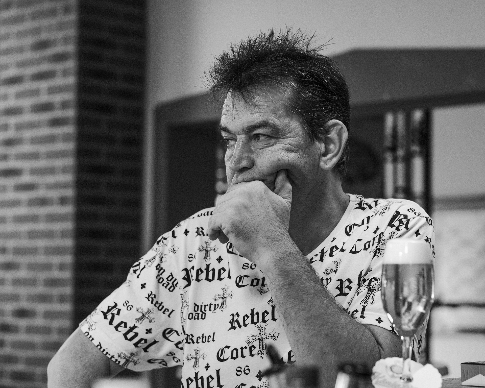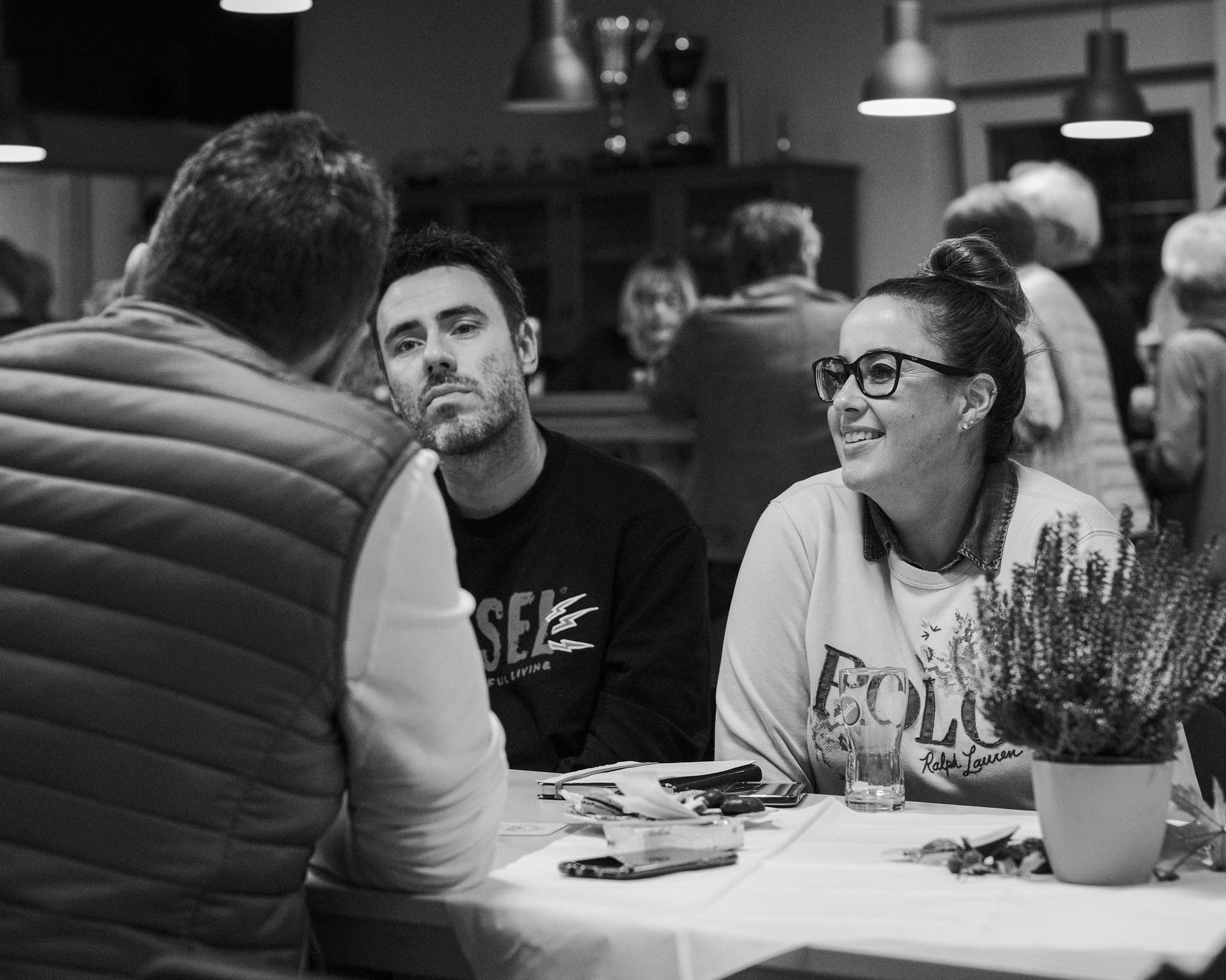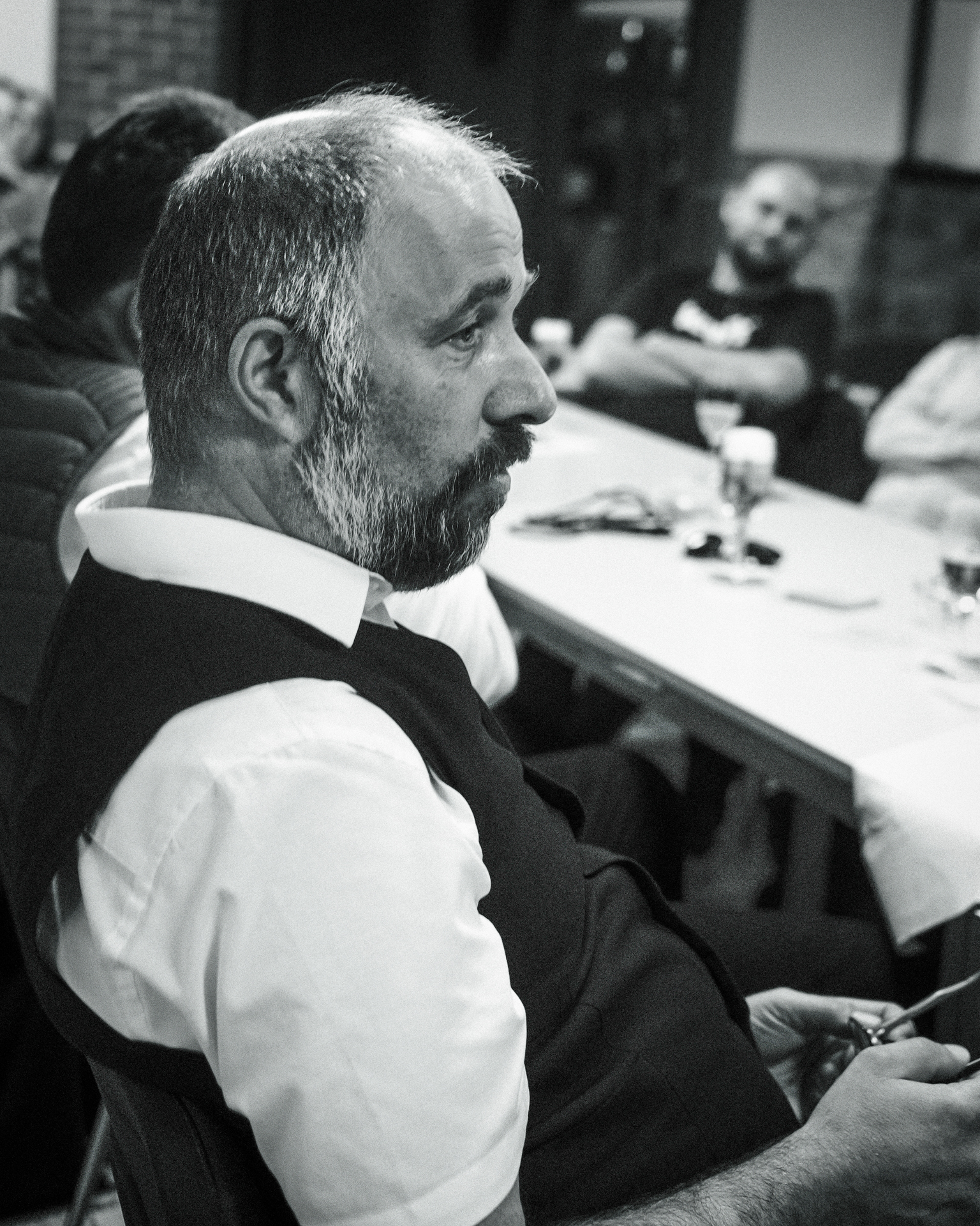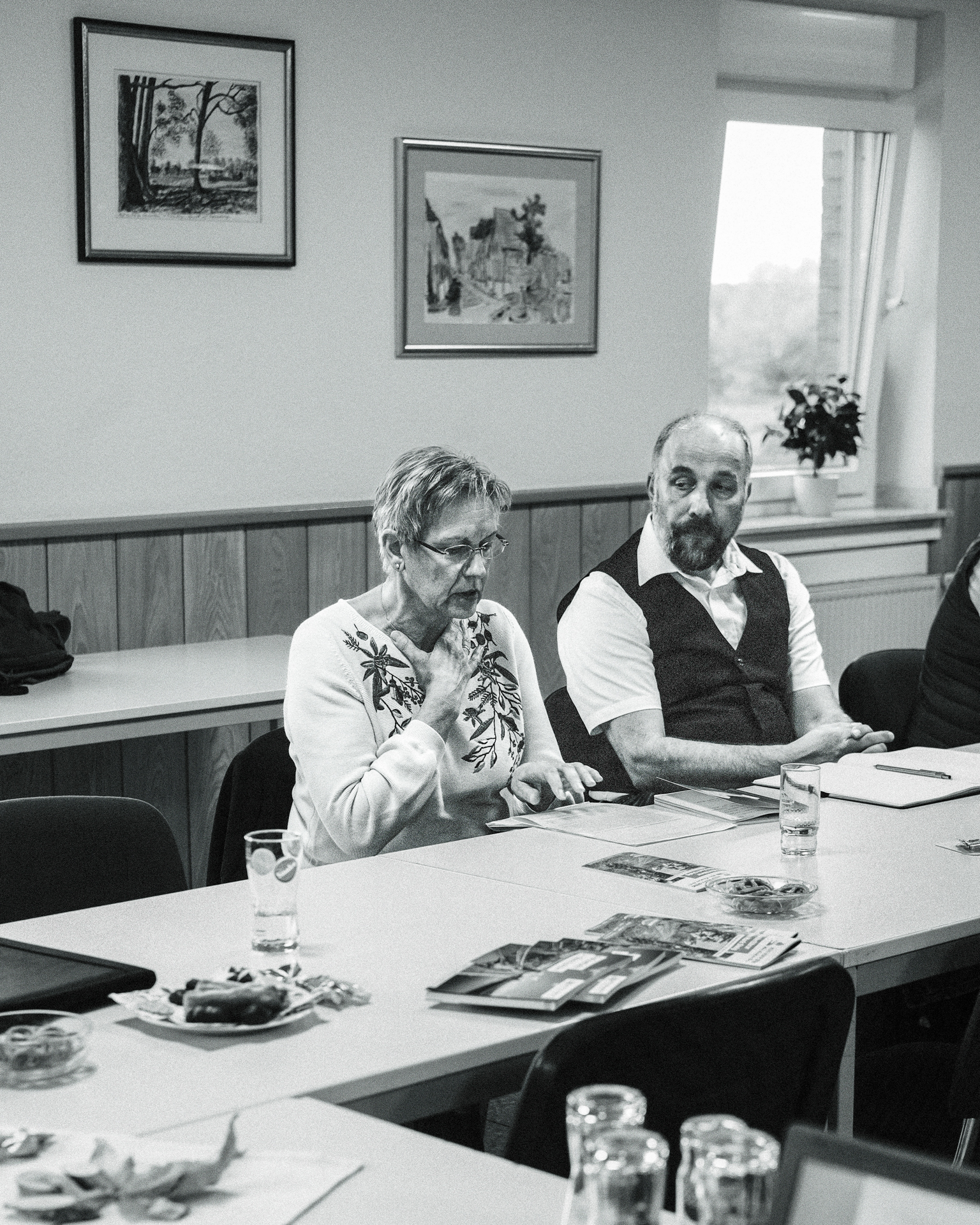 Im voll besetzten Saal durfte ich mit meinen beiden lautlosen Kameras dabei sein. Die Lichtverhältnisse setzten sich aus verschiedenen Kunstlichtquellen und Tageslicht zusammen, das durch die Fenster und zwei große Türen – meist als Gegenlicht – den Saal ganz unterschiedlich ausleuchtete. Gegen Ende der Veranstaltung wurde es erst dämmrig und dann dunkel. Da ich ohne Blitz mit dem jeweils verfügbaren Licht arbeite, um möglichst authentisch zu bleiben, war es nicht immer ganz einfach. Mit etwas Geschick bei der Positionierung der Kamera, lichtstarken Objektiven und meist weit geöffneten Blenden sowie Flexibiltät im Weißabgleich jedoch ganz gut beherrschbar.