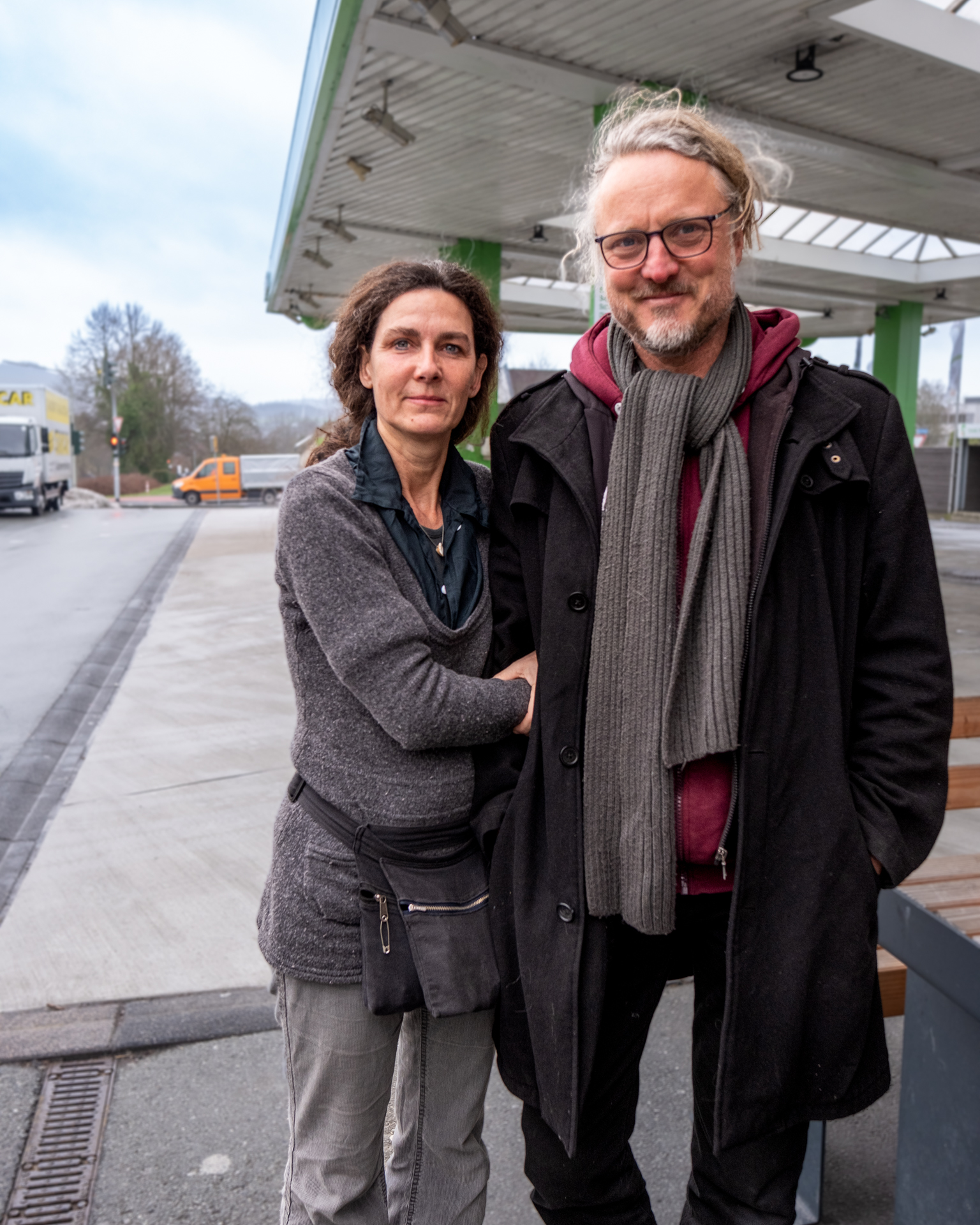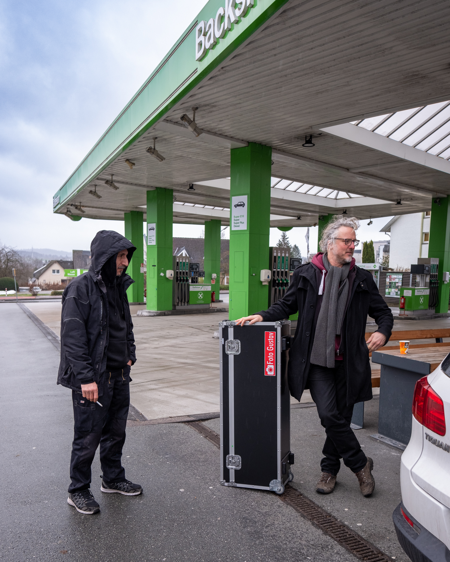 Zum schönen Abschluss habe ich am 31. Januar meine sperrige große Leinwand ausgeliefert. Auf einer Tankstelle in Meschede unweit der A46 traf ich die Theaterleute, um meine große Faltleinwand – ein ebay-Deal im Rahmen meiner Fotostudio-Auflösung – zu übergeben. Ein Teil der Crew war mit dem LKW auf dem Rückweg von Lennestadt, wo sie am Vorabend vor ausverkauftem Haus Goethes Faust aufgeführt haben.