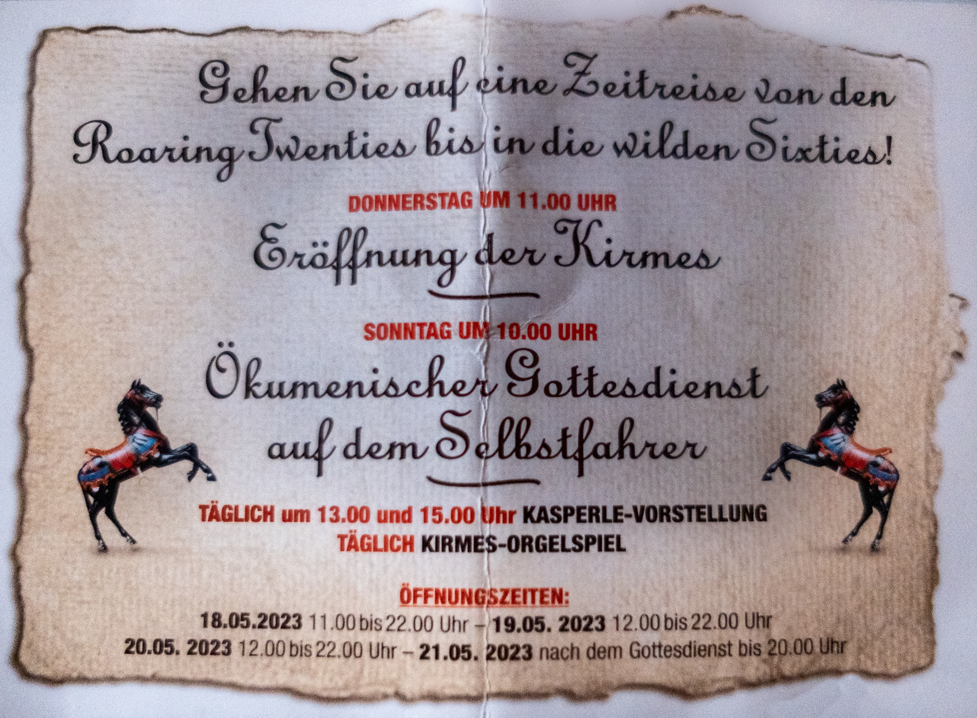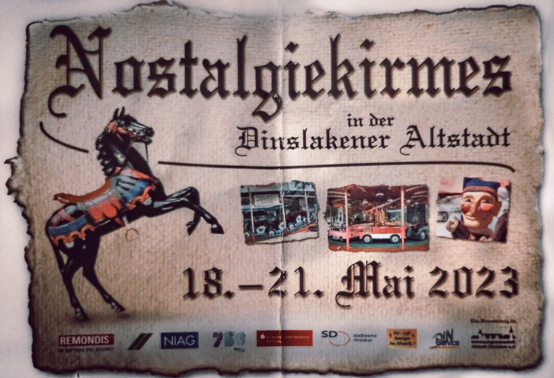 Anlässlich der 750-Jahrfeier kommt die Nostalgiekirmes in diesem Mai 2023 in die Dinslakener Altstadt zurück. Zuletzt konnte 2012 in Dinslaken eine Nostalgiekirmes veranstaltet werden. Dank der nicht nachlassenden Bemühungen von Herrn Dr. Ulrich Thekaten und der IG Altstadt sowie der Kooperationsbereitschaft aller Beteiligten wird es gelingen in eine Zeitreise von den 1920ern bis zu den 1960ern einzutauchen.