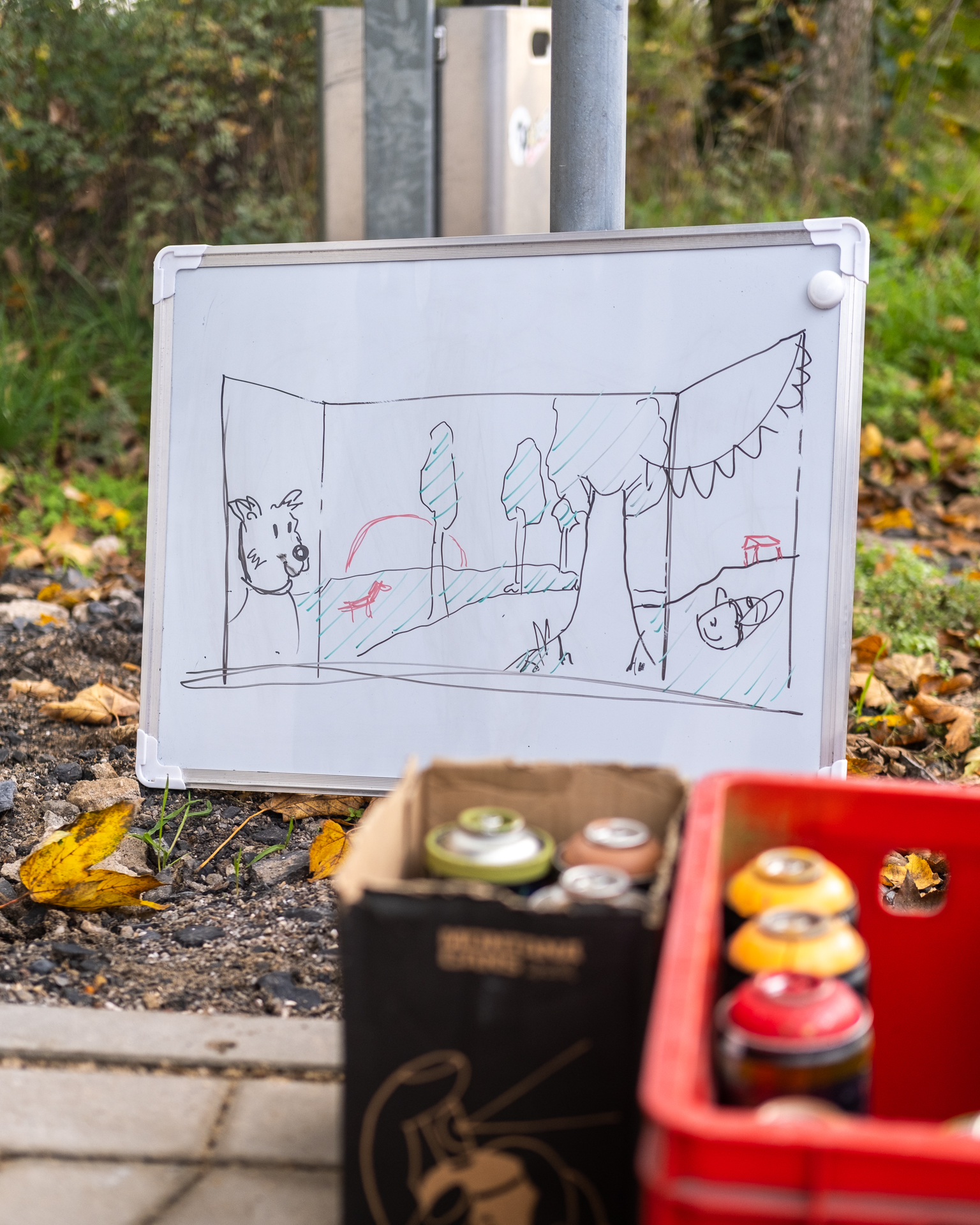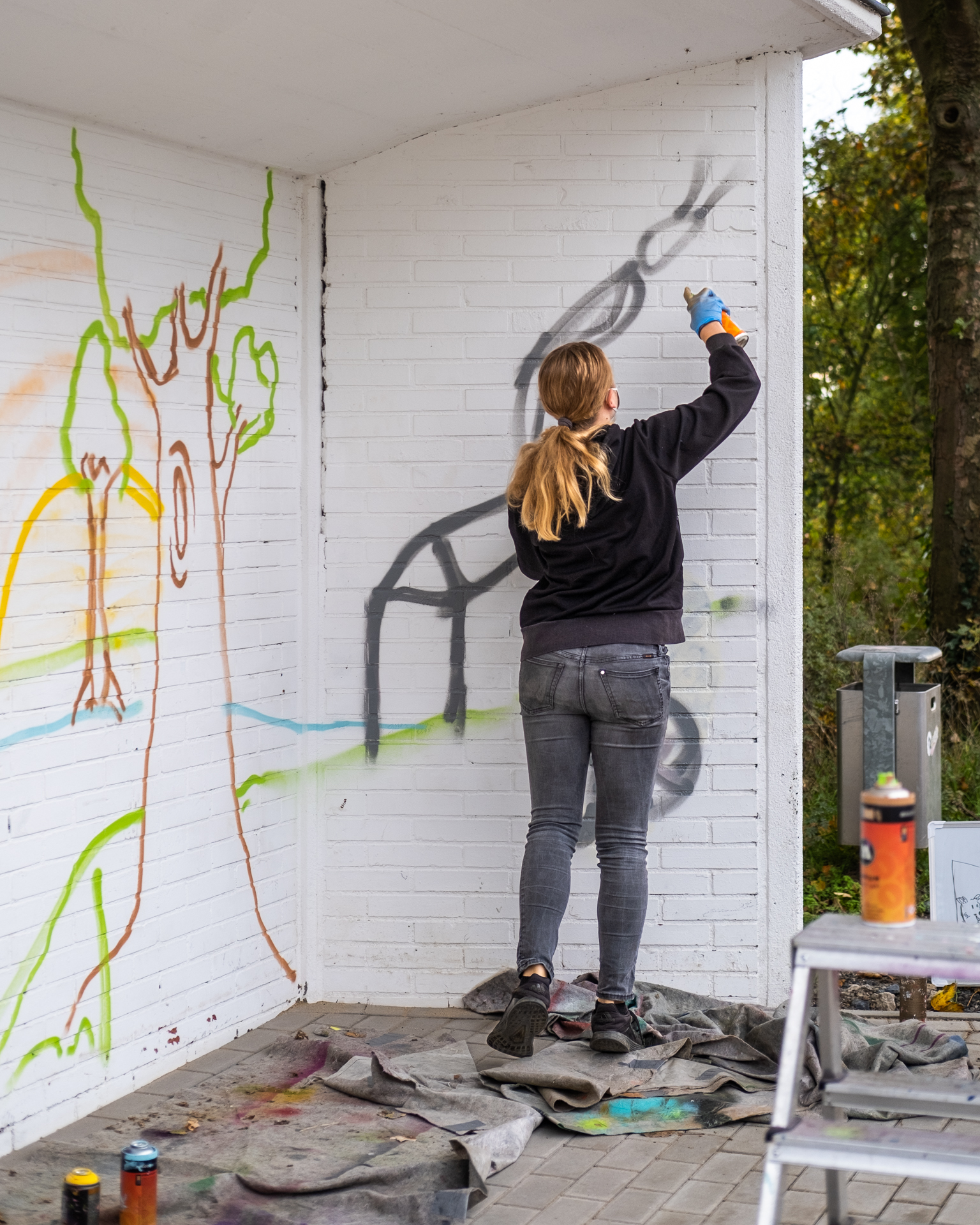 Zu Beginn des Workshops sensibilisierte Raphael die Teilnehmer:innen für die sichere Anwendung der Sprays und Hilfsmittel. Dann ging’s direkt mit praktischen Sprayübungen im Freien los. Im Schützenhaus Krudenburg schloss sich die kreative Phase an. Dabei geht’s um’s wie, was, wo etc. und auch um’s Abstrahieren und perspektivische Darstellungen. Schon bald purzeln begeistert die Ideen und konzeptionellen Ansätze. Tanzender Frosch oder Schwan, Tag oder Nacht, Leben, Feste, Feiern, Gasthäuser, Raketenbus, Brücke, Fluss, Straße, Sonne, Sterne, Feuerwerk oder … oder … Erste Skizzen entstehen, werden perspektivisch weiter entwickelt, vereinfacht, optimiert, auf die zur Verfügung stehenden Flächen angepasst oder aufgeteilt – oder auch mal verworfen. – spannend!