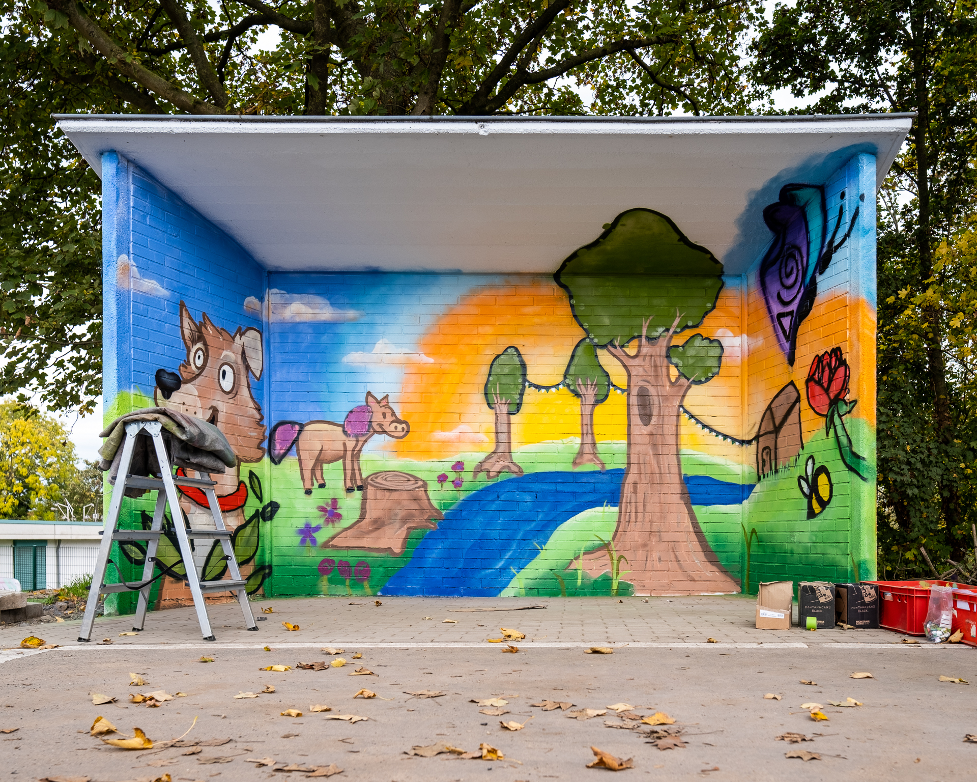 Annelie Giersch vom Quartierspunkt Hünxe realisierte gemeinsam mit Jutta Lievers-Vlaswinkel von der Dorfgemeinschaft Krudenburg die Idee, dass Kinder und Jugendliche aus der Gemeinde in einem Graffiti Workshop mit Raphael Wiese von “unprofessional.artworks” die Bushaltestelle neu gestalten. Bereits am Ende des ersten Workshoptages kann sich das heute noch unfertige Ergebnis prima sehen lassen. – BRAVO!