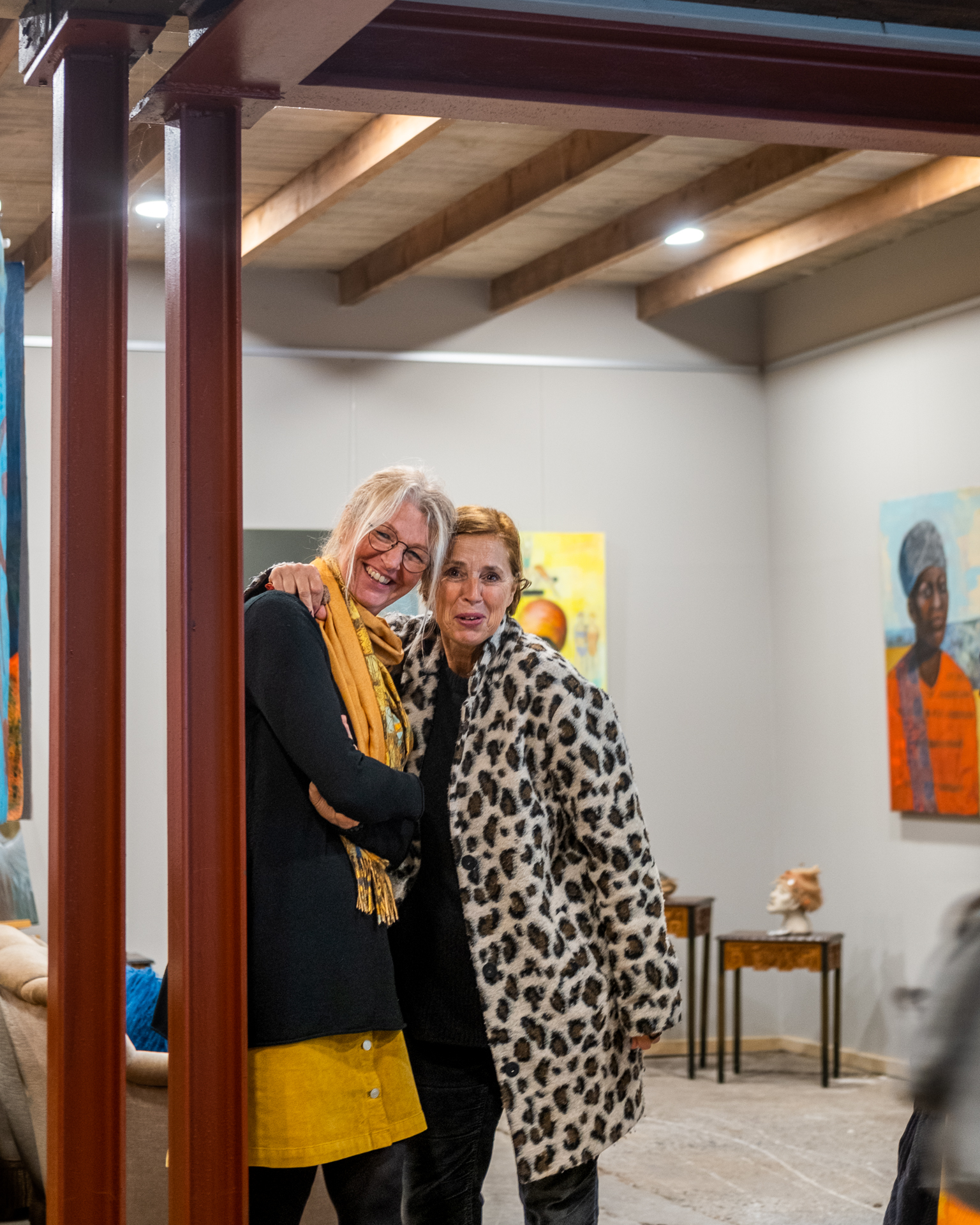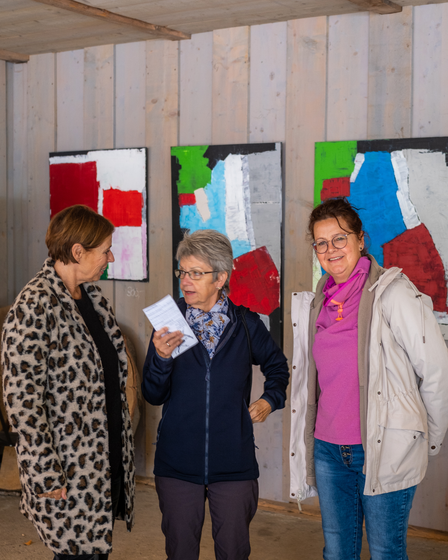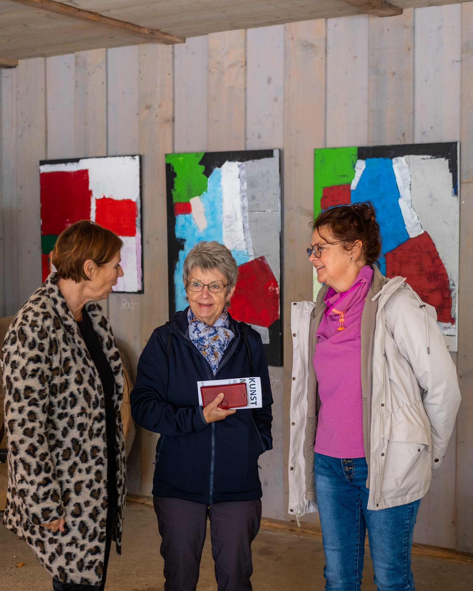Die jeweiligen Hintergründe der ersten und letzten beiden Fotos können uns vielleicht eine erste Idee von ihren Werken geben. Und die Protagonistinnen vor der Kunst vermitteln möglicherweise etwas von den angeregten Gesprächen, der lockeren Stimmung oder der Konzentration auf die nächste Aktion. Es sind mehr oder weniger zufällige Momente, wenn der Auslöser ‘unhörbar’ klickt.