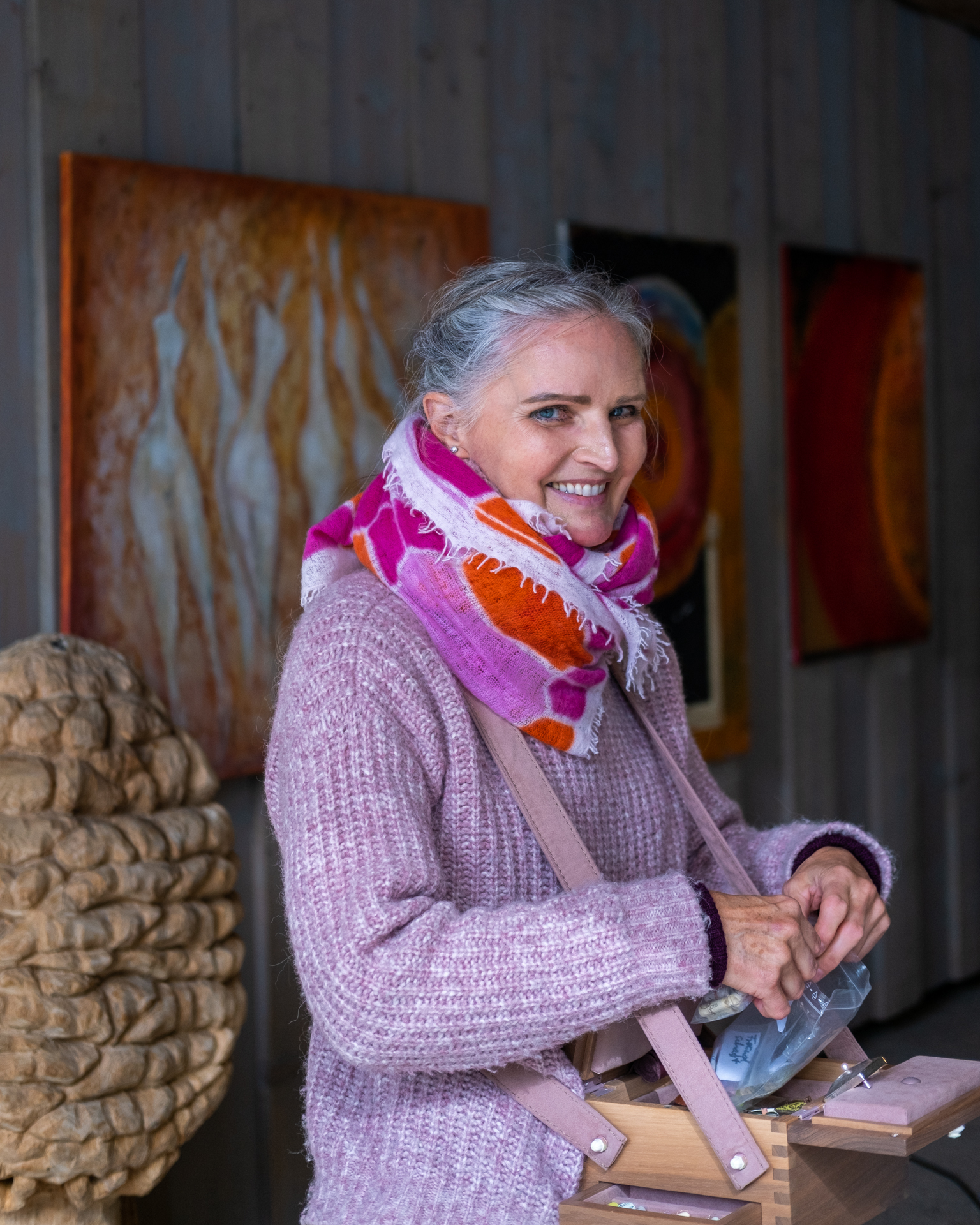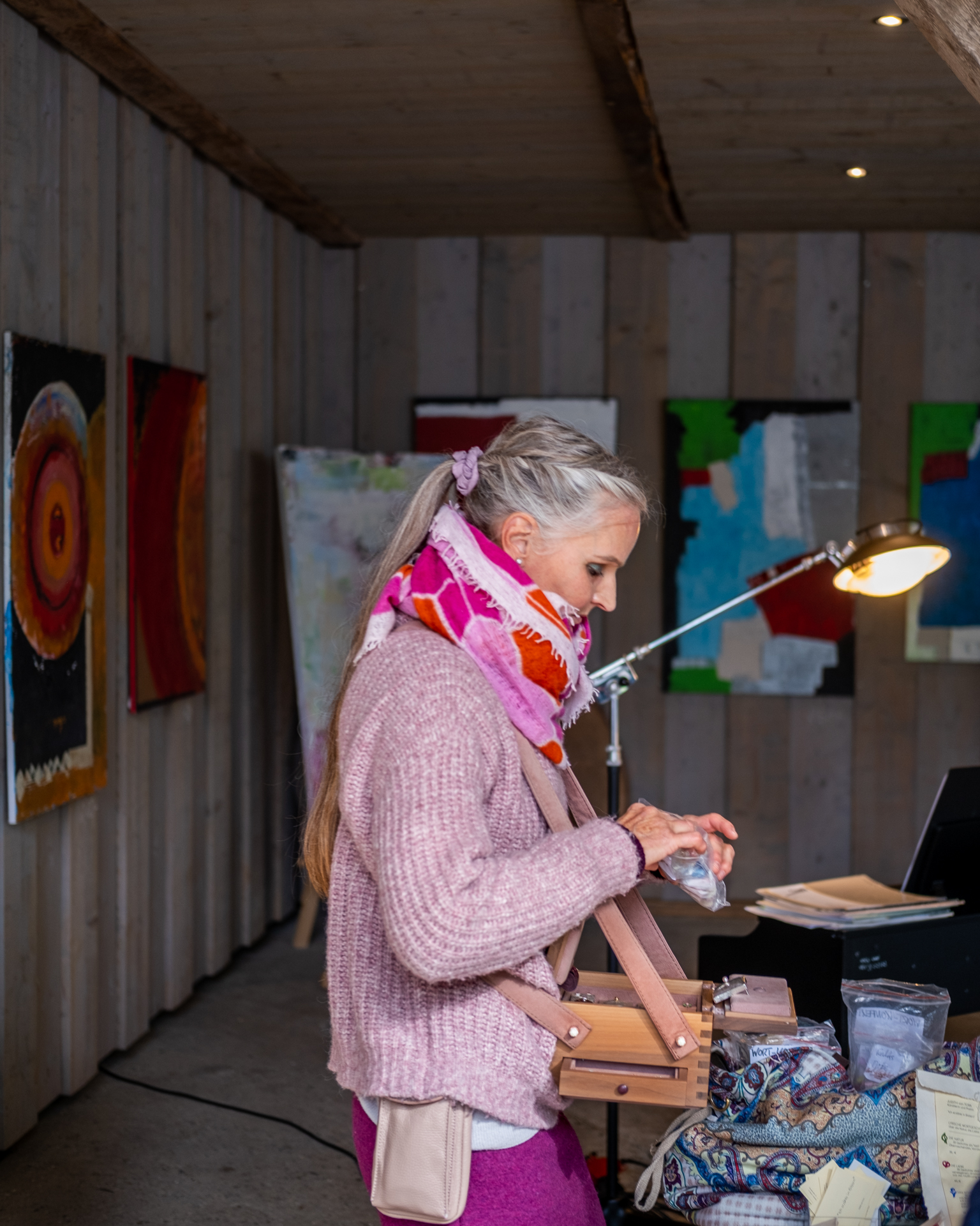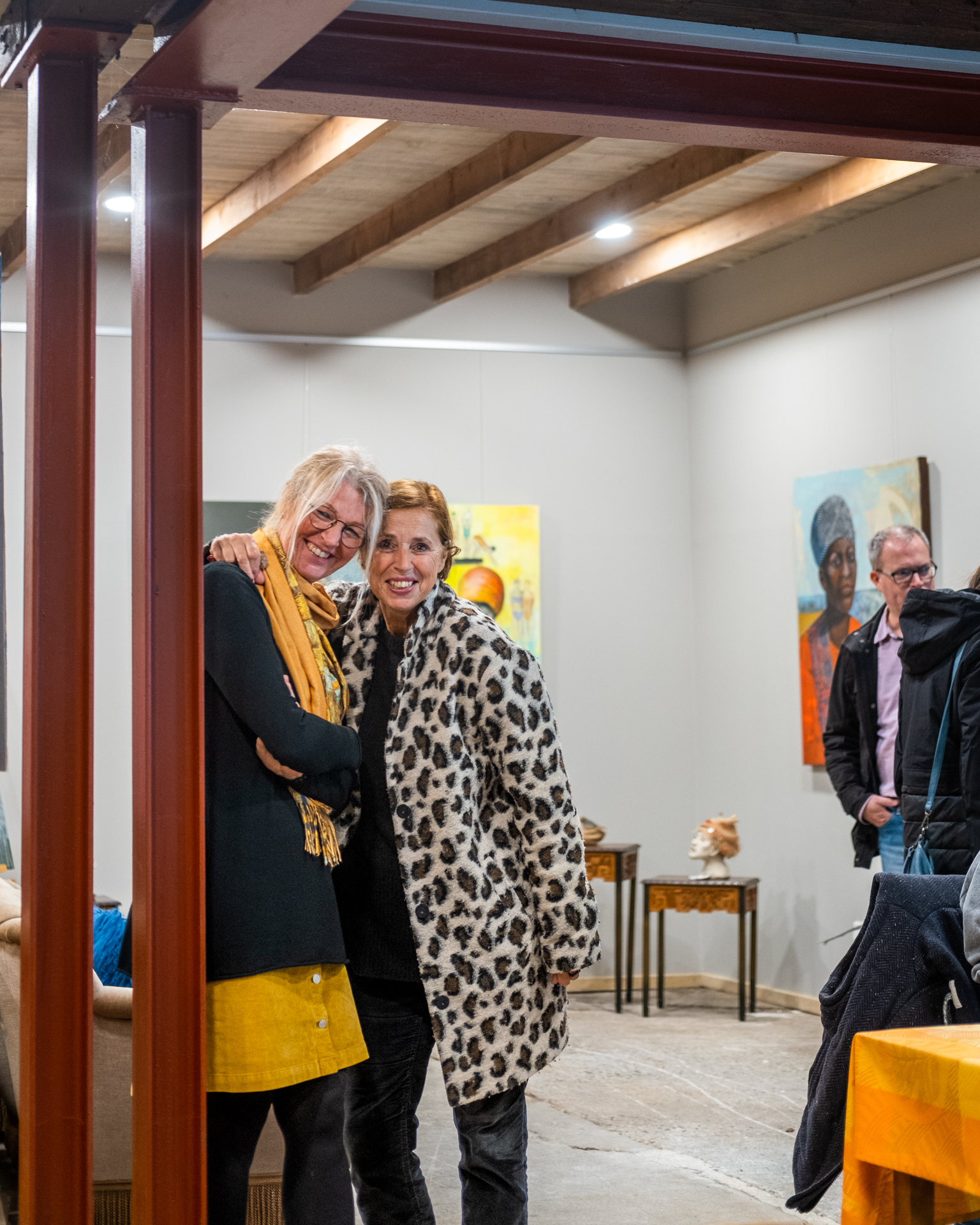 Die jeweiligen Hintergründe der ersten und letzten beiden Fotos können uns vielleicht eine erste Idee von ihren Werken geben. Und die Protagonistinnen vor der Kunst vermitteln möglicherweise etwas von den angeregten Gesprächen, der lockeren Stimmung oder der Konzentration auf die nächste Aktion. Es sind mehr oder weniger zufällige Momente, wenn der Auslöser ‘unhörbar’ klickt.