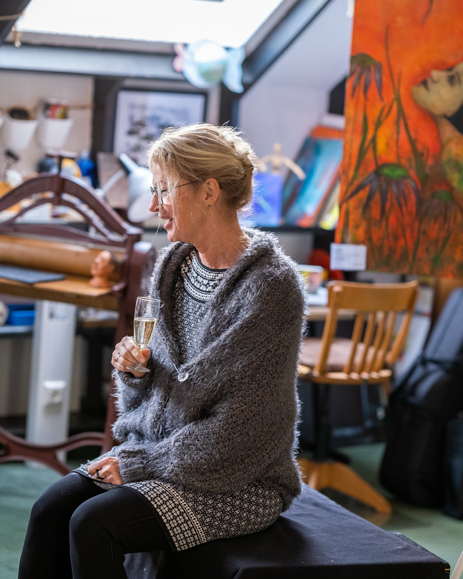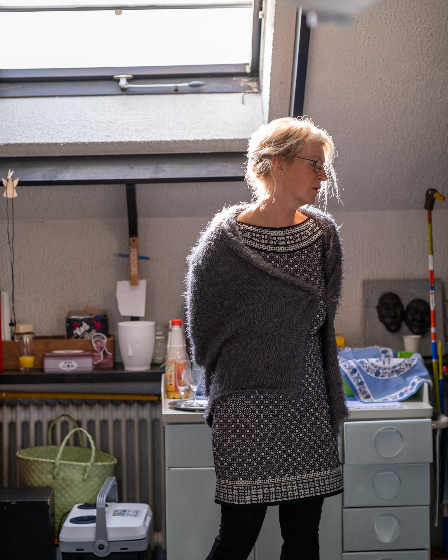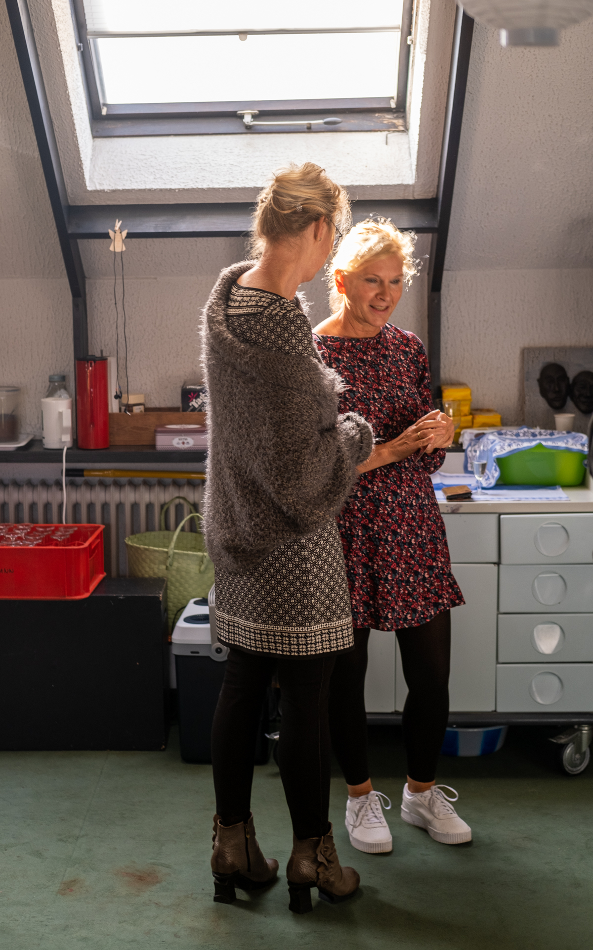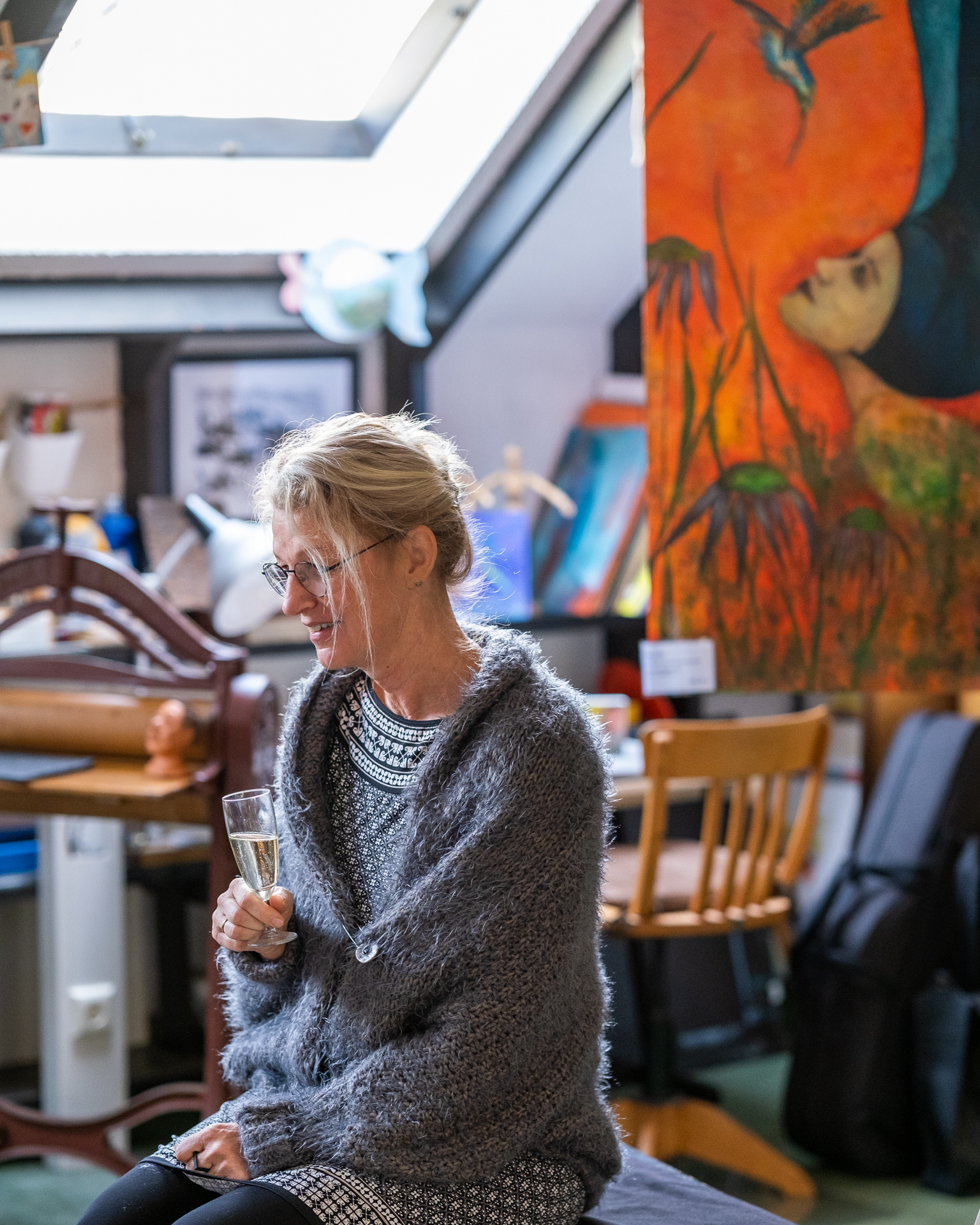 Gustav: “Elke, Danke für die Gelegenheit heute dabei sein zu dürfen, was für ein wunderschönes, lichtdurchflutetes Atelier. Wo entstehen Deine Bilder?” Elke: “Je nach dem, also an verschiedenen Stellen. Ich male gelegentlich auf einer Staffelei, manchmal direkt an der Wand, hauptsächlich auf diesem Tisch einer ehemaligen Hobelbank auf dem es heute allerdings u.a. Kaffee und selbstgebacken Kuchen etc. aus meinem Freundeskreis und der Familie gibt.”
