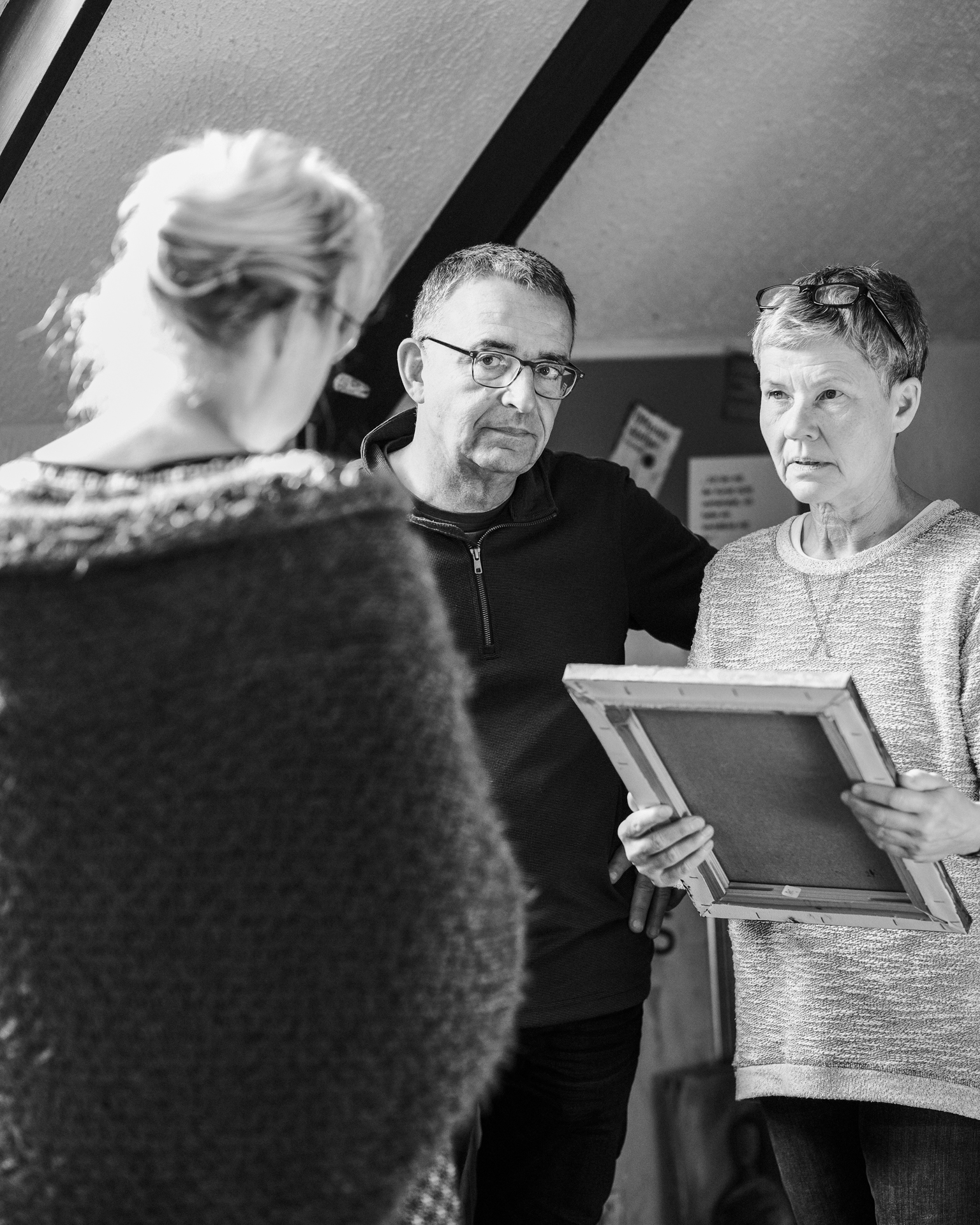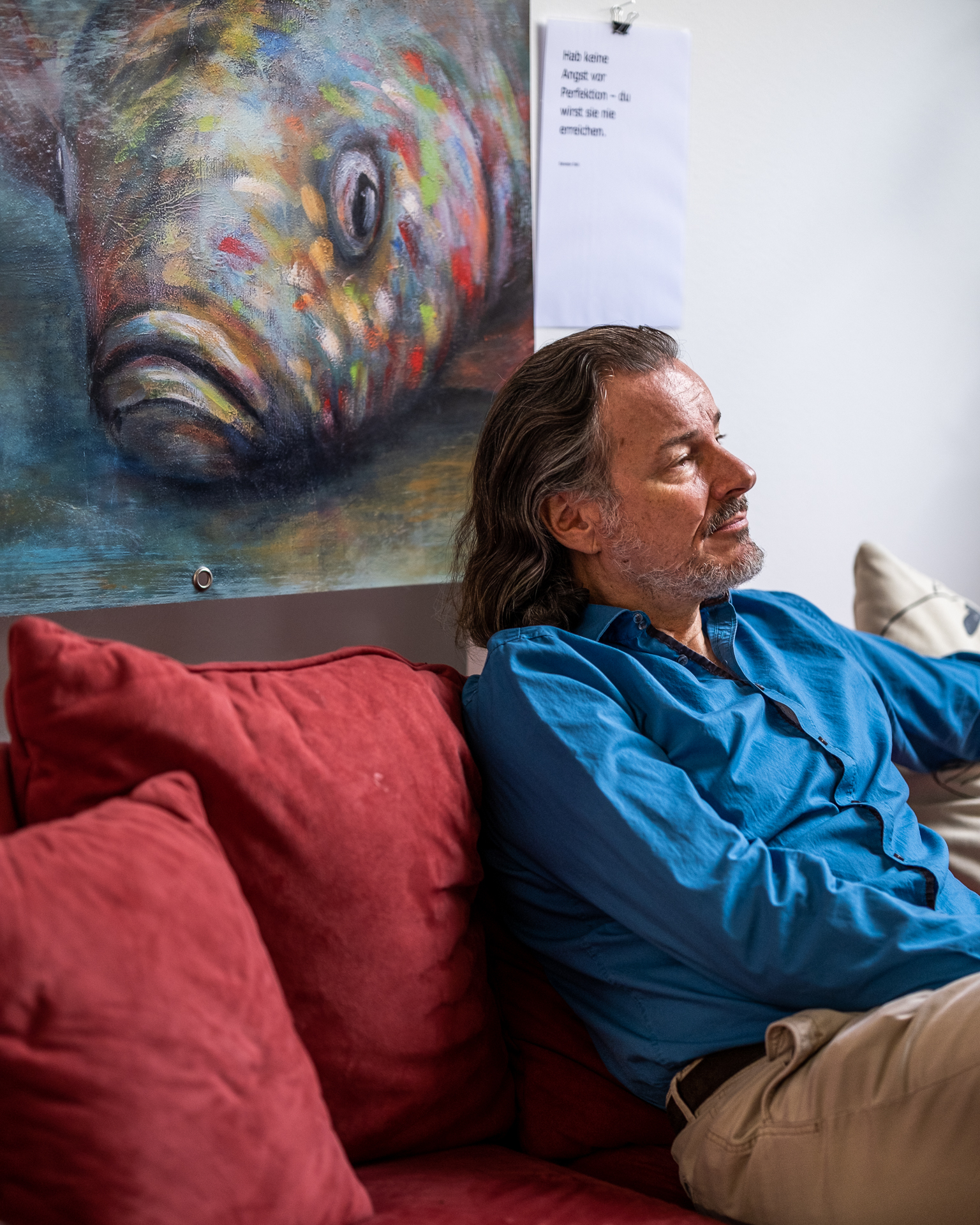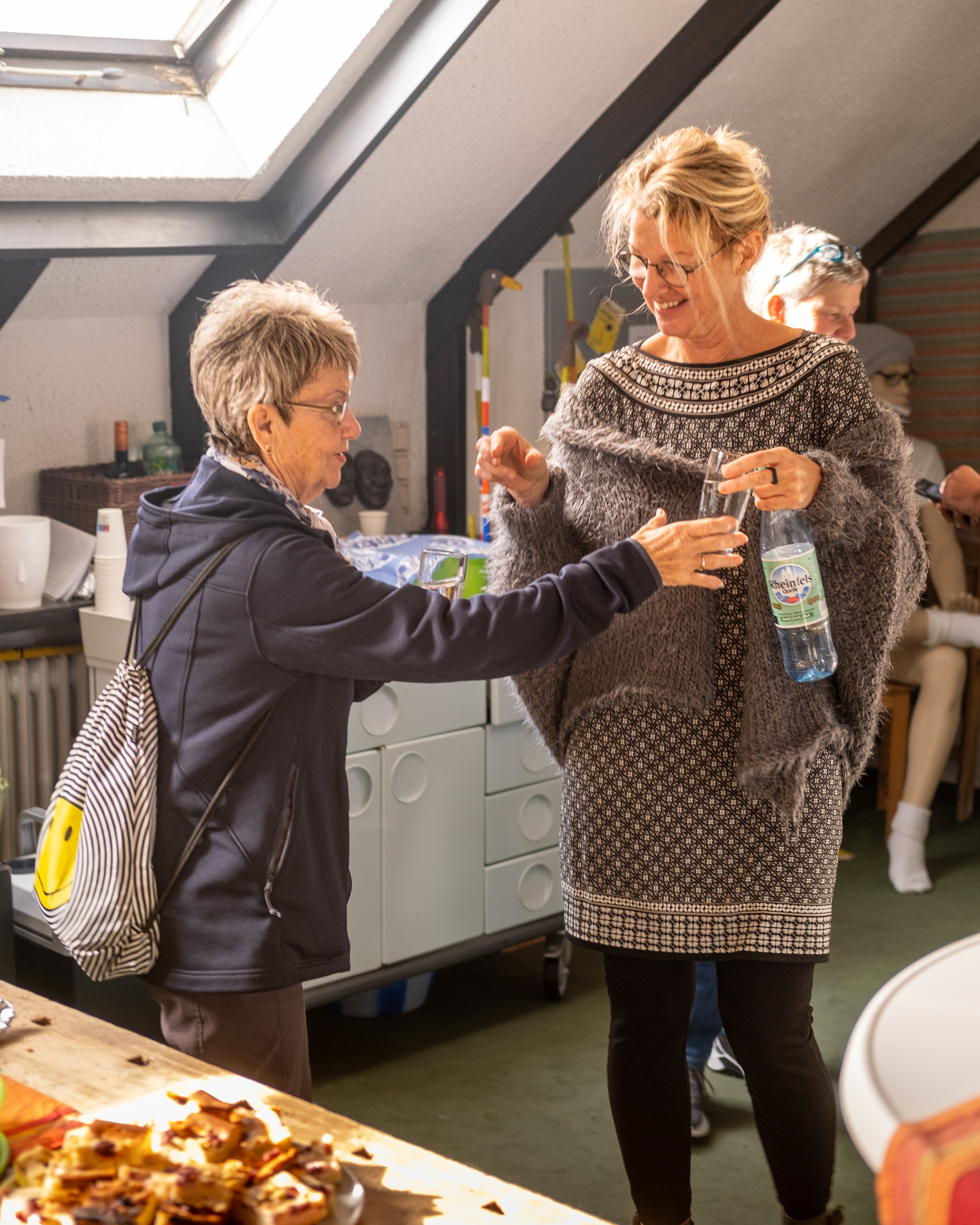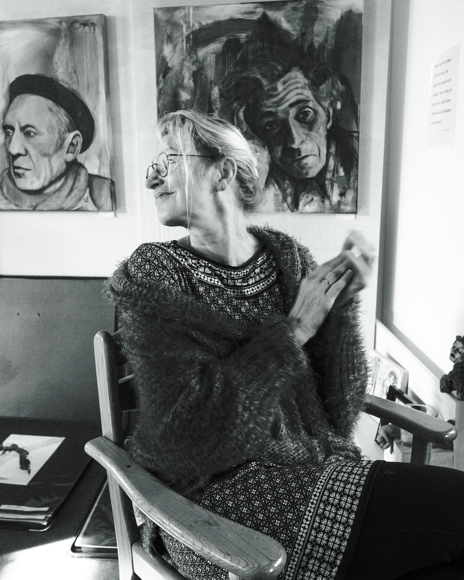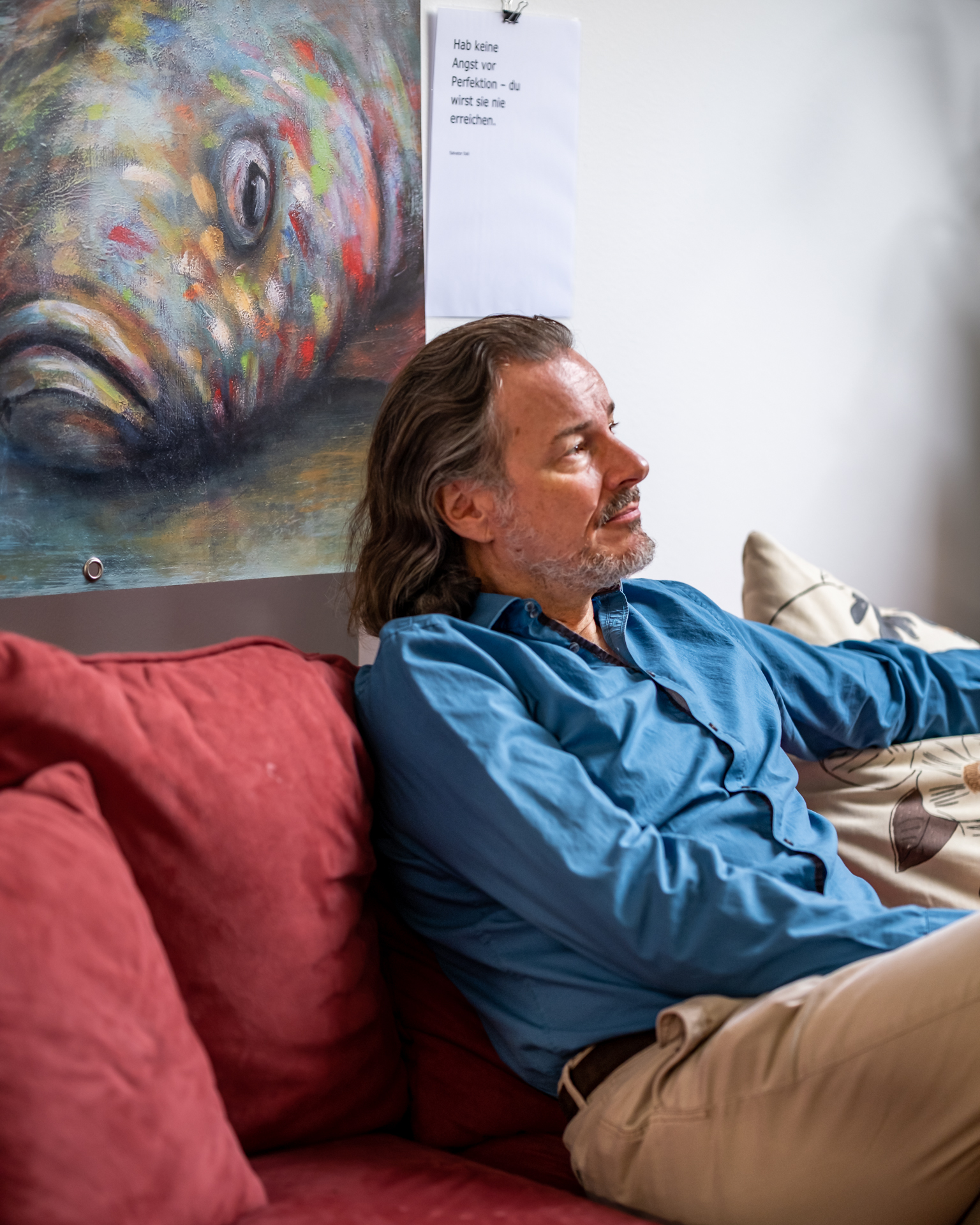 Gustav: “Elke, Danke für die Gelegenheit heute dabei sein zu dürfen, was für ein wunderschönes, lichtdurchflutetes Atelier. Wo entstehen Deine Bilder?” Elke: “Je nach dem, also an verschiedenen Stellen. Ich male gelegentlich auf einer Staffelei, manchmal direkt an der Wand, hauptsächlich auf diesem Tisch einer ehemaligen Hobelbank auf dem es heute allerdings u.a. Kaffee und selbstgebacken Kuchen etc. aus meinem Freundeskreis und der Familie gibt.”