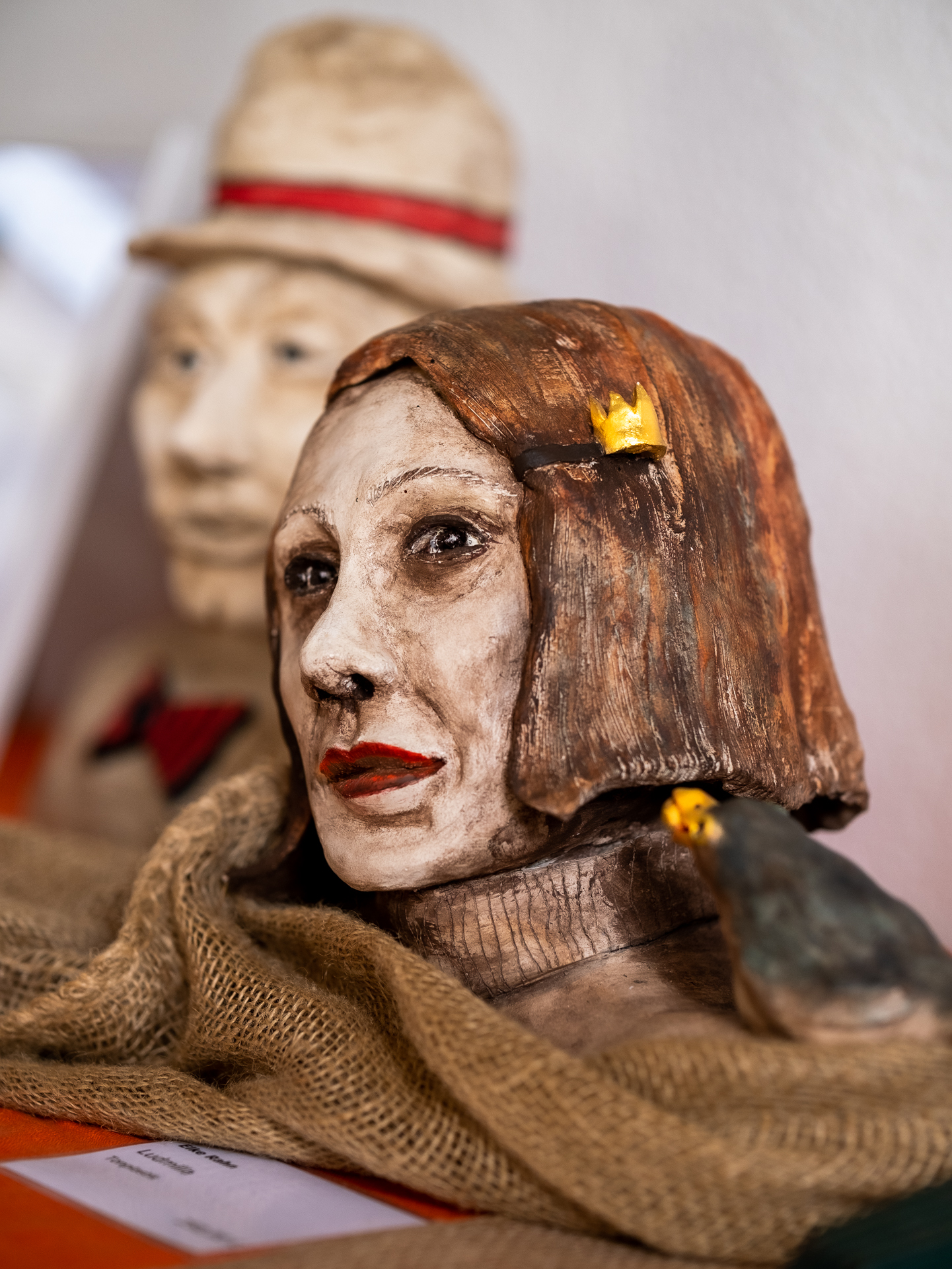 Gustav: Deine Plastiken faszinieren mich. Und das ist nicht nur ihre Dreidimmensionalität. – Welche Materialen nutzt Du bei den hier vor uns stehenden Plastiken (Ludmilla, Bild 31842 Galerie 2 , Bild 31851 Galerie 3)?” Elke: Das ist in diesen Arbeiten: Ton!” Gustav: “Kannst Du kurz beschreiben, wie Du vorgehst oder wie grob der Ablauf ist?” Elke: “Ja, gern. Am Anfang ist da ein Klumpen Ton vor mir auf dem Tisch auf den ich meine Hände lege. Langsam beginne ich dann zu modulieren. Wichtig sind dann die Augen. Wenn die Augen Gestalt annehmen, fange ich an mit der Figur zu reden. In dieser Arbeit hier ist das zum Beispiel Ludmilla. Bei diesem ‘Dialog’ vollende ich die Form. Dann kommt ein erster Brand. Gustav: “Wie kommt zu den unterschiedlichen Farben der Plastiken?” Elke: Nun das Ausgangsmaterial Ton gibt es in verschiedenen Grundfarben. Andere Farbpigment ‘massiere’ ich mit den Händen während des Gestaltungsprozesses ein. Sehr feine Farbstrukturen bringe ich mit dem Pinsel auf, wie zum Beispiel hier das Hutband. Ein zweiter Brand fixiert schließlich die Arbeit!” Gustav: Brennst Du hier im Atelier?” Elke: “Nein, ich brenne bei einem befreundeten Künstler oder demnächst vermutlich auch öfter in der Kunstschule Wesel.” Gustav: Herzlichen Dank für alles!“