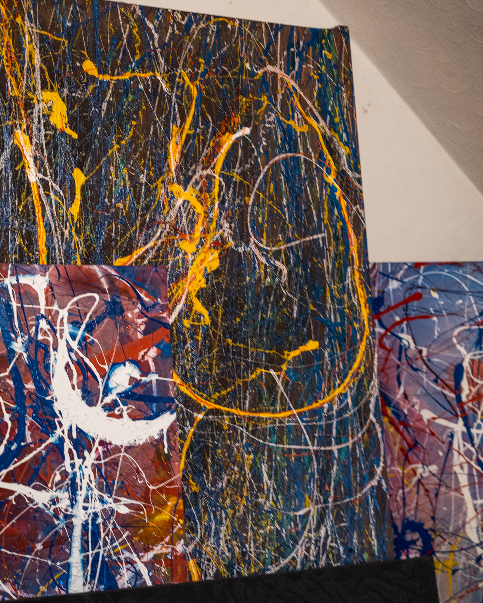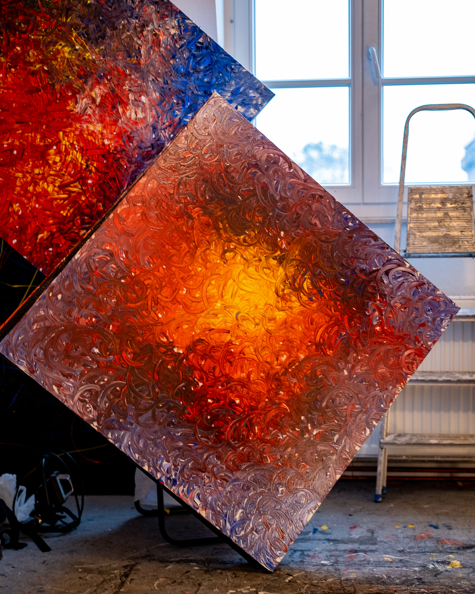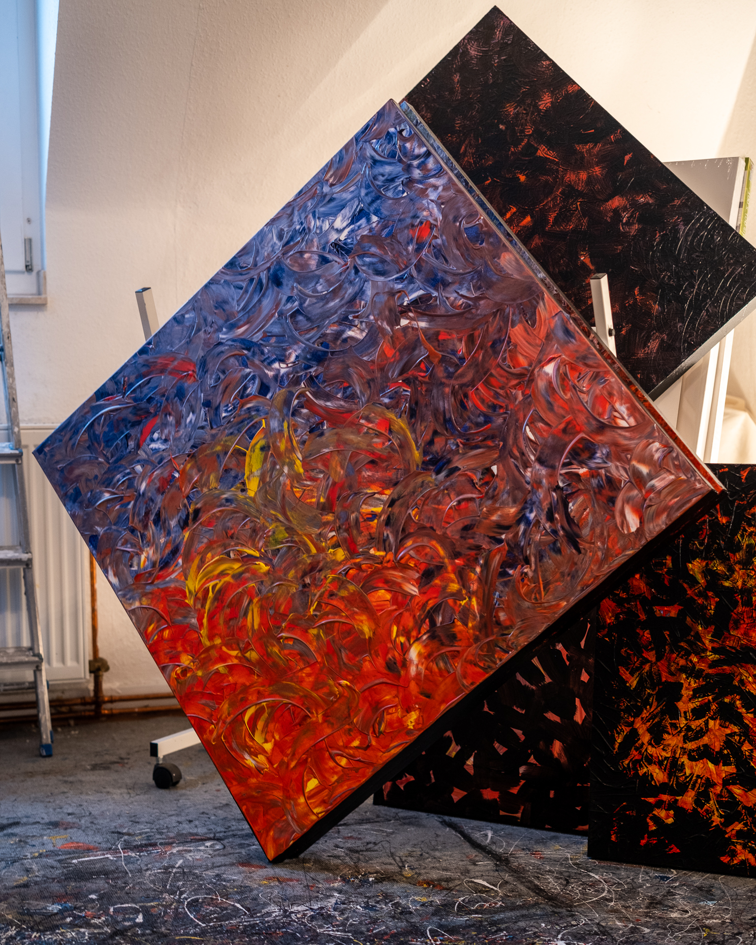 Gustav: “Wie entstehen Deine Bilder, an der Wand oder auf einem Tisch oder benutzt Du eine Staffelei?” Ron: “Nein, hier direkt Mitten im Raum auf dem Boden. Da kann ich zum Beispiel vor dem hellen Fenster am besten frei arbeiten. Ich mag nichts was mich einengt. Ich brauche Platz; Raum für fließende Bewegungen.”