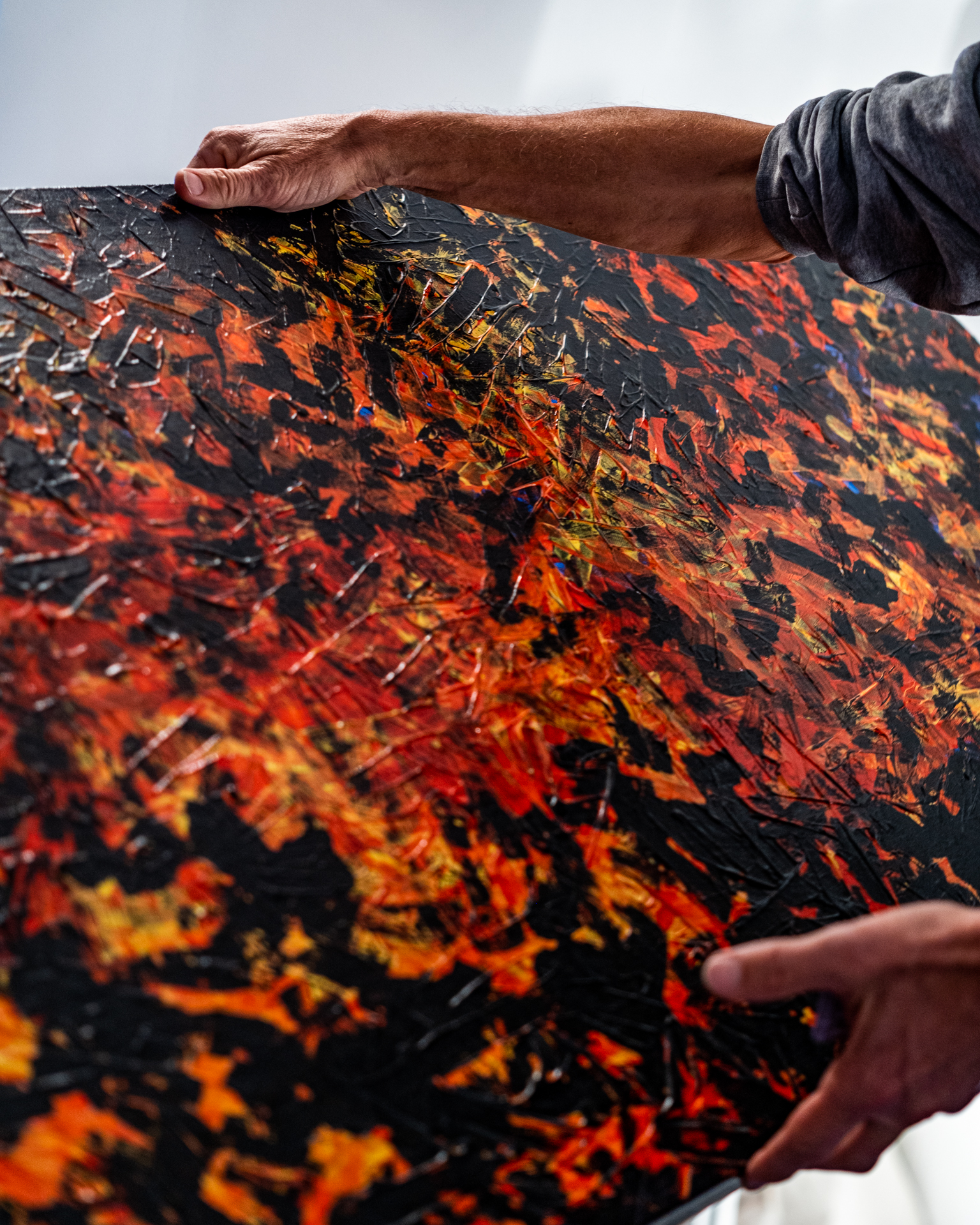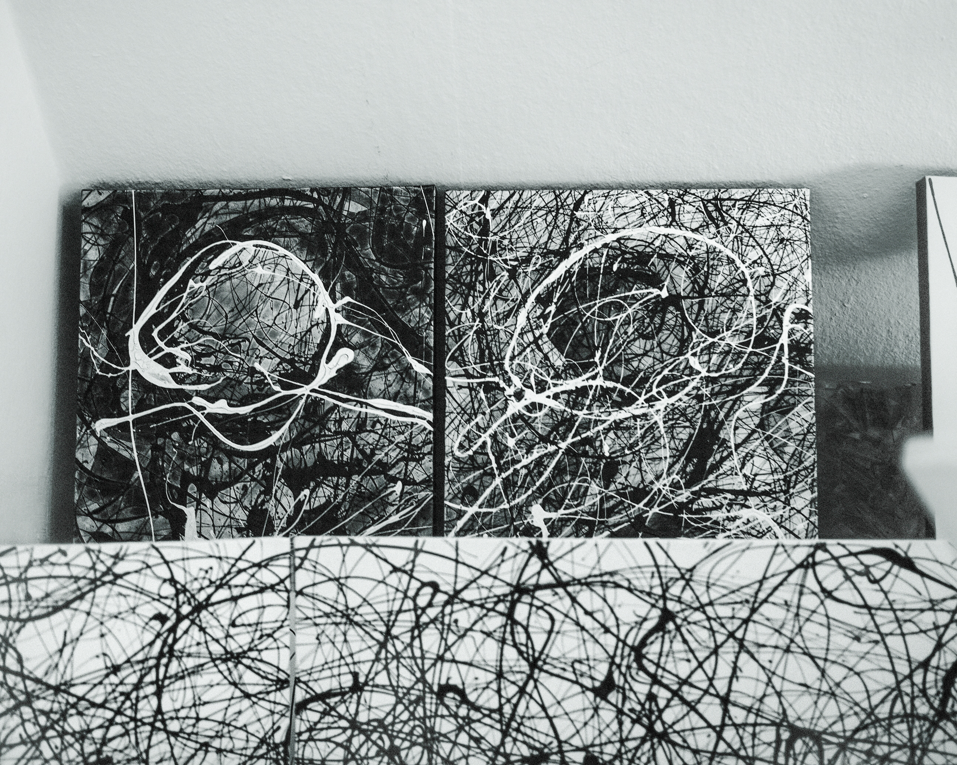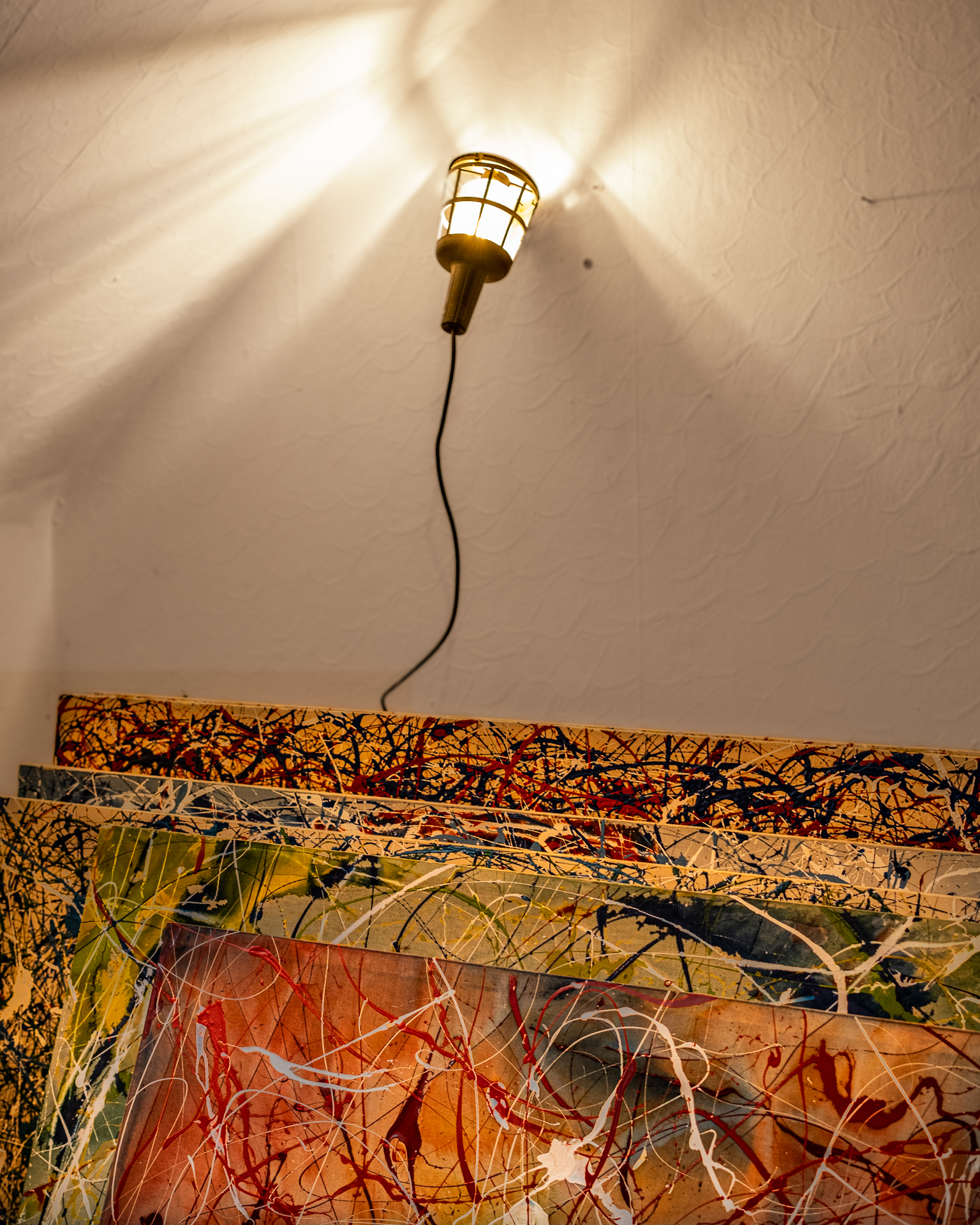 Gustav: “Wie entstehen Deine Bilder, an der Wand oder auf einem Tisch oder benutzt Du eine Staffelei?” Ron: “Nein, hier direkt Mitten im Raum auf dem Boden. Da kann ich zum Beispiel vor dem hellen Fenster am besten frei arbeiten. Ich mag nichts was mich einengt. Ich brauche Platz; Raum für fließende Bewegungen.”