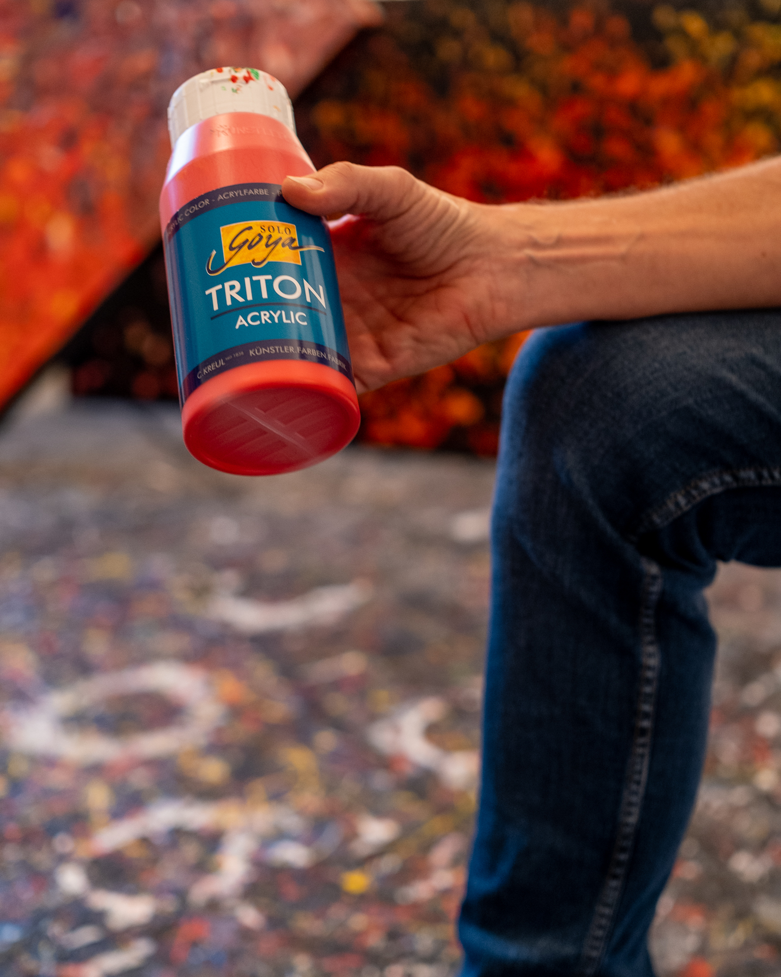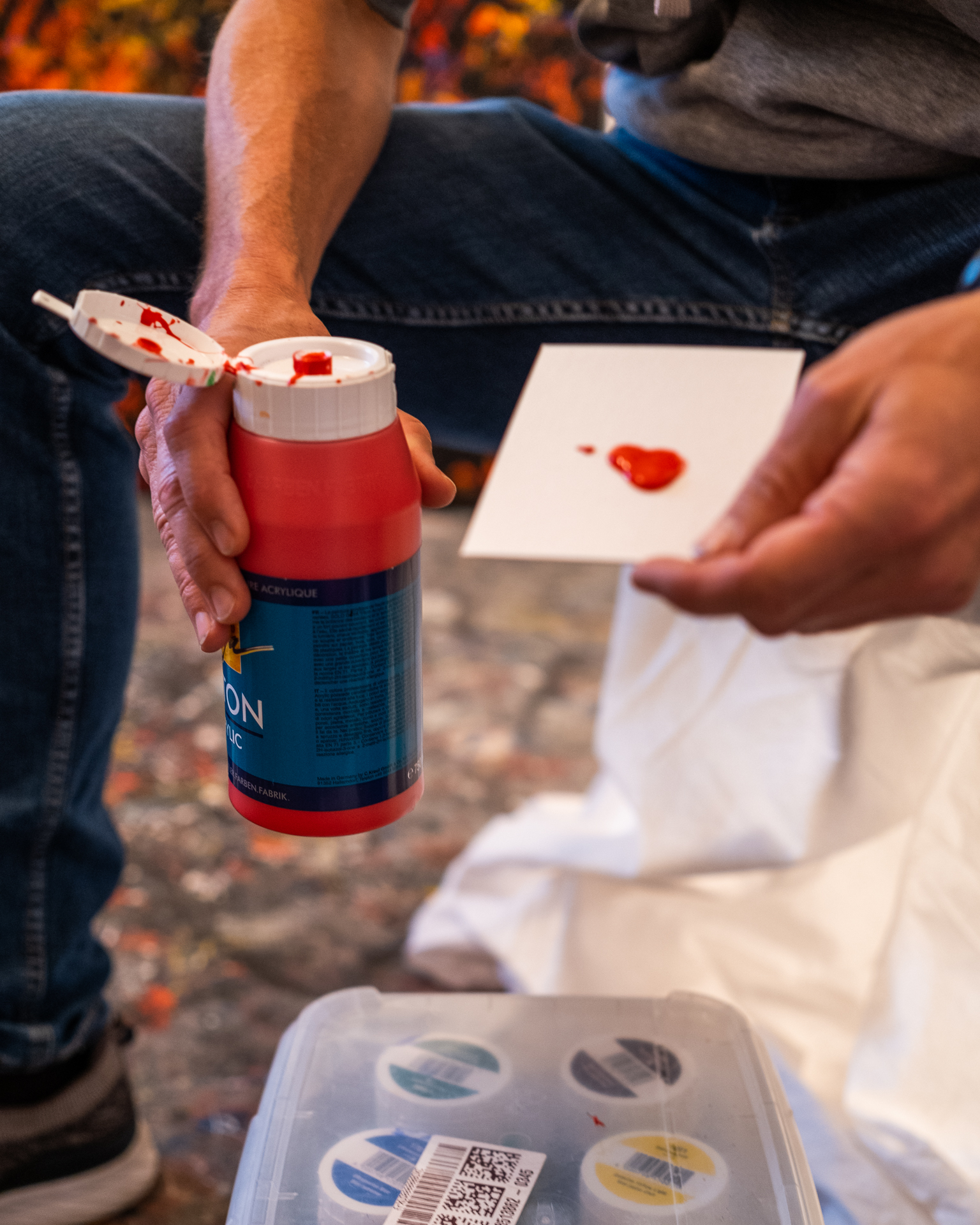 Gustav: “Wie ich sehe benutzt Du Leinwände und Acrylfarbe. Wie kommt die Farbe auf die Leinwand?” Ron:, während er auf mehrere unbemalte Leinwände unterschiedlicher Größen deutet: “Ja es sind vorgefertigte Leinwände, von der Stange sozusagen. Am Anfang hab ich sie quasi aus Dachlatten selber gebaut. – hab ja auch mal Schreiner gelernt; aber das ist schon ein paar Tage her.” Dann holt Ron einige Flaschen mit Acrylfarbe, öffnet eine und kippt etwas rote Farbe auf ein Blatt Papier, während er erklärt: “Hier seht ihr die zäh-flüssige Konsistenz. Ich nutze oft monochrome Farben aus dem Regenbogen-Spektrum, die ich mit fließenden Bewegungen Punkt- und Linienweise aus einigen 10cm Abstand auf der Leinwand verteile. Dann strukturiere und gestalte ich sie in einem ersten Schritt zum Beispiel mit einem Spachtel oder ähnlichem … Oder mit den Händen, arbeite von innen nach außen. In einem weiteren Schritt füge meist schwungvoll aus der Bewegung heraus weitere Farbe hinzu, arbeite dann von außen nach innen. Das ganze wiederholt sich ein paar Mal.”