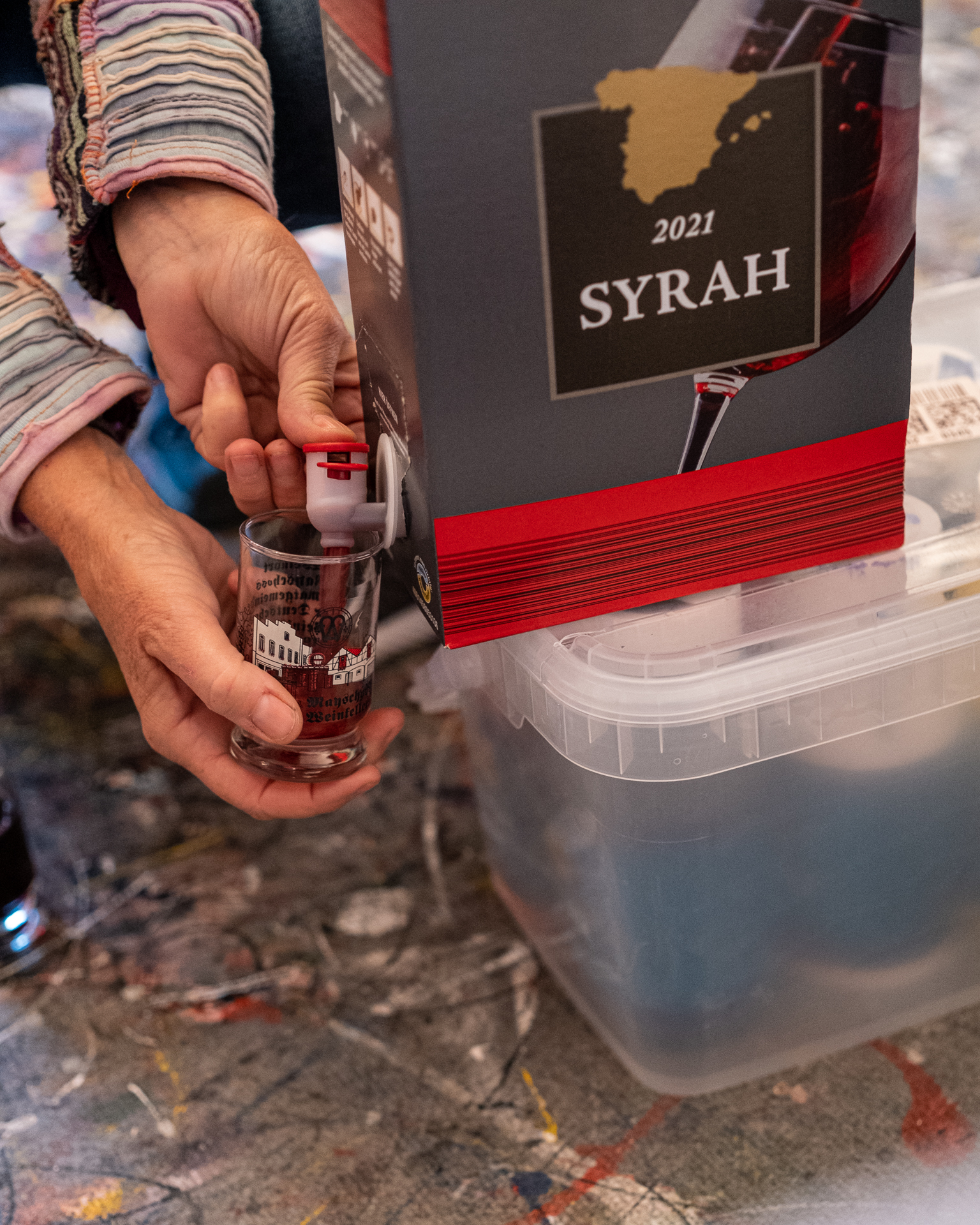 Ron: “Apropos Pause, trinkt ihr einen Schluck Rotwein mit?” Es gibt Rotwein aus dem Kanister und wir lassen uns gerne einladen. Ron: “Ich bin hauptberuflich Kunstlehrer in Bocholt. Und beides macht mir Freude. Gustav, was ist Deine Motivation?” Gustav: ” Ich bin seit sieben Jahren Rentner und Privatier. Nach einem aktiven, meist selbstständigen Berufsleben brauchst Du eine sinnvolle Beschäftigung, um in kein schwarzes Loch zu fallen oder nur noch auf dem Sofa zu sitzen. Ich war zuerst Mit dem Fahrrad auf den Spuren der Jakobspilger 12.000 km in Westeuropa unterwegs, einige Etappen gemeinsam mit Walli, die letzten 500 km zu Fuß.” Damit danach nicht doch noch das schwarze Loch kommt, fotografiere ich – neuerdings auch kleine Reportagen über Themen die mich interessieren und Spaß machen, so wie heute. Danke Ron, dass Du mitmachst.”